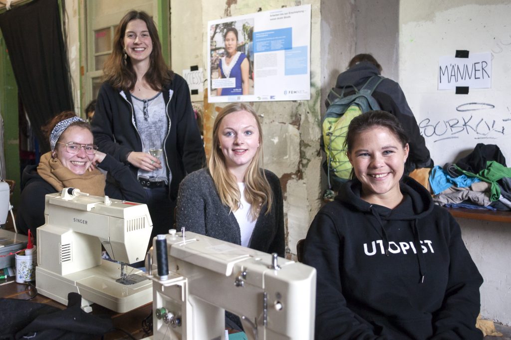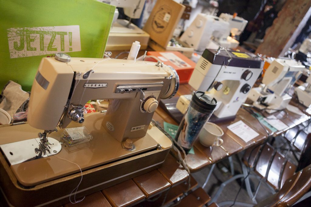 Direkt neben an hat sich das „Fadenwerk“ breit gemacht. Eine Nähtruppe aus ehrenamtlichen Utopist*innen, die sich zwei Mal im Monat trifft um gemeinsam zu nähen und eine schöne Zeit zu verbringen. Die fleißigen Utopist*innen haben 10 Nähmaschinen aufgebaut, die den Raum im vollen Betrieb mit dem charakteristischen „klacken“ füllen. Aus alten, aussortierten T-shirts werden hier schicke und ausgefallene Umhängebeutel gezaubert. Kinder probieren sich unter fachlicher Anleitung an den Nähmaschinen aus und basteln so ihre eigenen Kreationen. Designs werden entworfen, eigene Klamotten verziert und aufgehübscht. Ganz wie beim monatlichen Treffen des „FadenWerks“ kommen auch hier Unbekannte ins Gespräch, geben ihr Wissen weiter und erfreuen sich des Selbstmachens. So kann Aktionismus und der Kampf gegen den Wegwerf-Fast-Fashion Spaß machen!