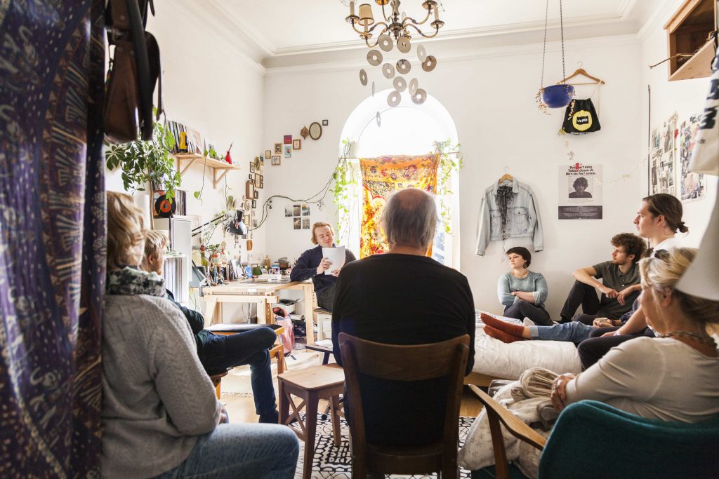 Worum geht’s? Nachbarn und Nachbarinnen lesen ihre Lieblingstexte vor – dort, wo es ihnen gefällt: im eigenen Wohnzimmer, in der Küche, im Treppenhaus, auf dem