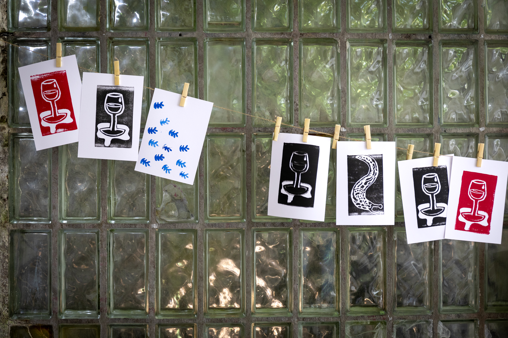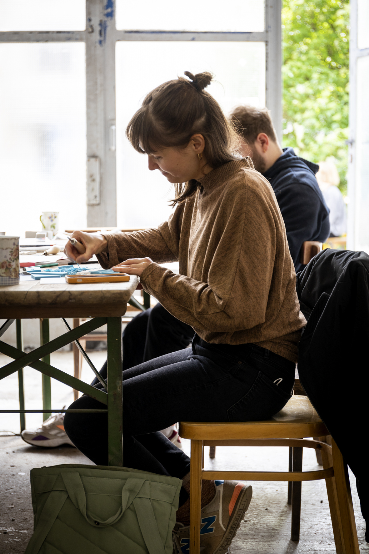 In der Werkhalle wurde im Rahmen der Ausstellung aber nicht nur Kunst ausgestellt – sie wurde dort auch geschaffen. Im Rahmen von zwei Workshops führte Nadine Interessierte in den Ablauf des Linoldrucks ein und eröffnete somit Raum für angewandte Kreativität. Im Rahmen des Verfahrens werden sogenannte Softcutplatten zu Stempeln umgearbeitet, in dem gewisse Teile der Platte abgetragen werden. Anschließend wird die Farbe dann mit Walzen auf die „Stempel“ aufgetragen und auf Papier gedruckt. Bis dato hat Nadine die Workshops immer nur mit Kindern und Jugendlichen umgesetzt. Die Umsetzung gestaltet sich mit Erwachsenen hingegen wesentlich simpler, da oftmals bereits umfängliche Vorstellung für die Technik und den Entwurf besteht. Durch die Umsetzung der Workshops überträgt Nadine ihre Arbeit als Kunstpädagogin und Designerin in gewisser Weise auf den außerschulischen Bereich und kombiniert ihre eigenen künstlerischen Arbeiten mit didaktischen Lehrmethoden. Die Workshops wurden mithilfe einer finanziellen Förderung durch den Mirker Quartiersfonds ermöglicht.