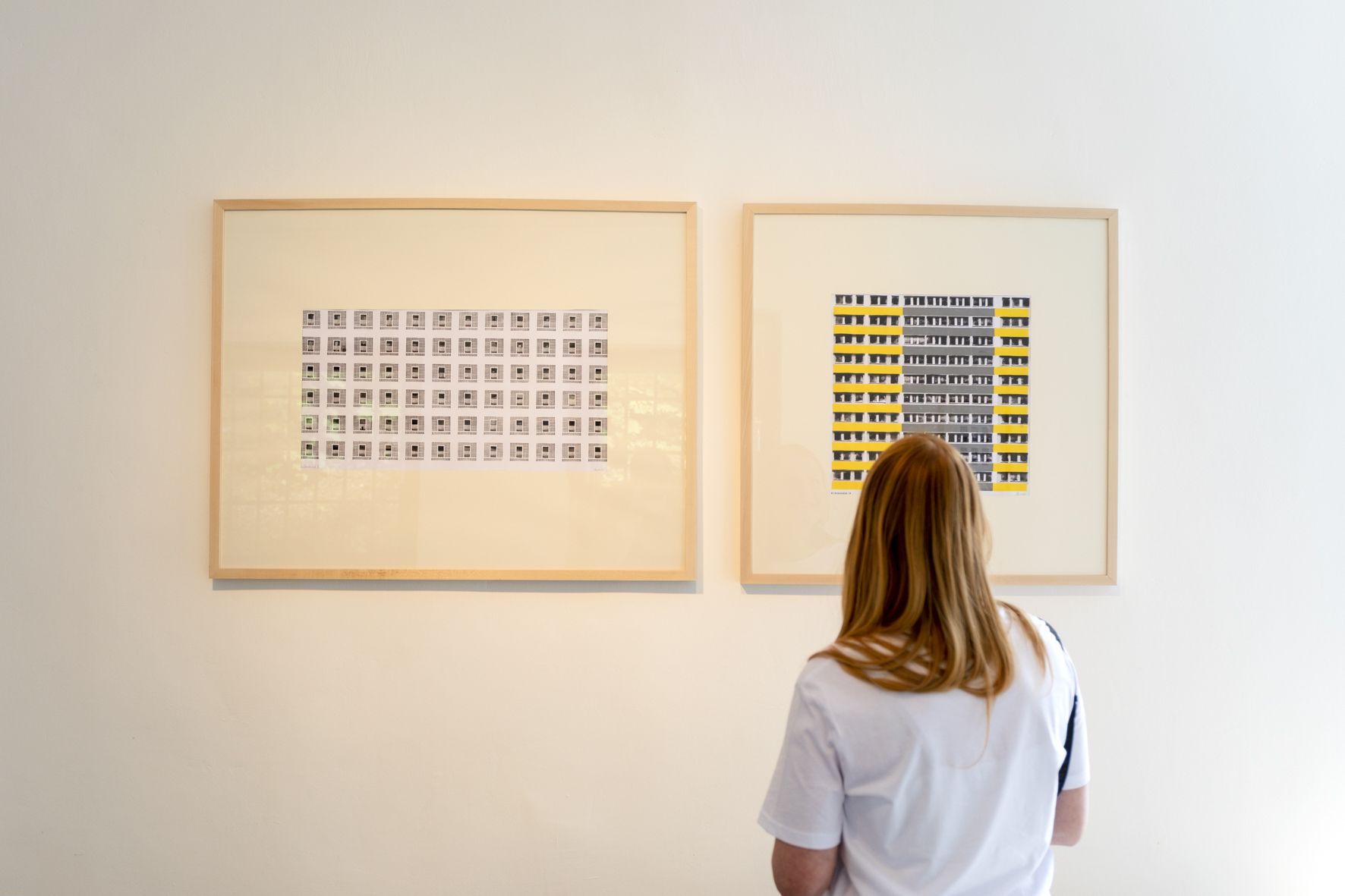 Nadine setzt sich in den Arbeiten, die im Rahmen der Ausstellung zu sehen sind, mit Formen und Wiederholungsstrukturen auseinander. Dabei bezieht sie sich immer wieder auf Alltagsgegenstände und alltägliche Phänomene, die sie in ihren Werken mithilfe von verschiedenen Techniken auf grafische Elemente, Raster und Strukturen runterbricht und rekonstruiert. In der Ausstellung zeigt sie drei unterschiedliche, aufeinander aufbauende Werkzyklen, die in Bezug auf ihren historischen Entstehungsprozess auf räumlicher Ebene voneinander getrennt ausgestellt werden. In gewisser Weise zeigt die Ausstellung also auch den künstlerischen Werdegang der Künstlerin in den letzten 4 Jahren. Im regulären Eingangsbereich der Hebebühne sind Tuschezeichnungen aus der Reihe »everyday circles« ausgestellt. Wie der Name es offenbart, bedient sich Nadine in dieser Reihe dem Kreis und seinen differenten Erscheinungsformen im Alltag. Im benachbarten Raum sind mixed media Arbeiten aus der Reihe »neighborhood« zu sehen. In den Werken verbindet die Künstlerin Tuschezeichnung und Drucktechnik miteinander und bezieht sie auf Hausfassaden und ihre sich wiederholenden Rasterstrukturen. Vom Punkt der Betrachtung abhängig erscheinen die Fassaden entweder als Gemälde oder als Fotografie – erst das Herantreten offenbart die tatsächliche Natur der Bilder. Der dritte Teil der Ausstellung ist in der ehemaligen Werkhalle ausgestellt. Seit geraumer Zeit beschäftigt sich Nadine nun schon mit Linoldruck und den Spezifika der Drucktechnik. Der Raum offenbart einige der Arbeiten, die aus dieser Beschäftigung entsprungen sind und z.B. Musik mit Hilfe von Tonspuren visualisiert. Dadurch wird sie nicht nur optisch auf eine sehr gewisse Weise erlebbar, sondern auch in ihrer grafischen Form konserviert.