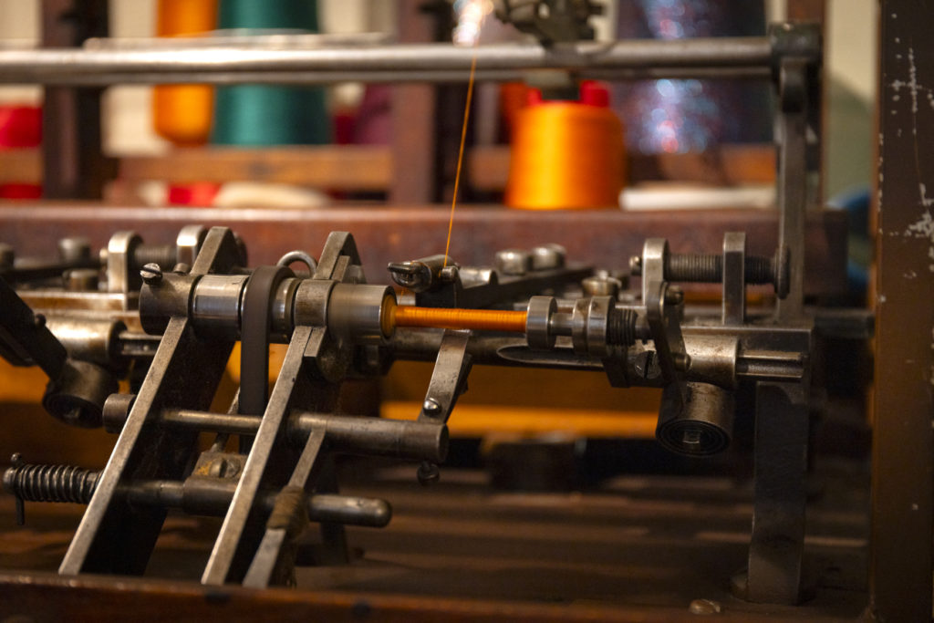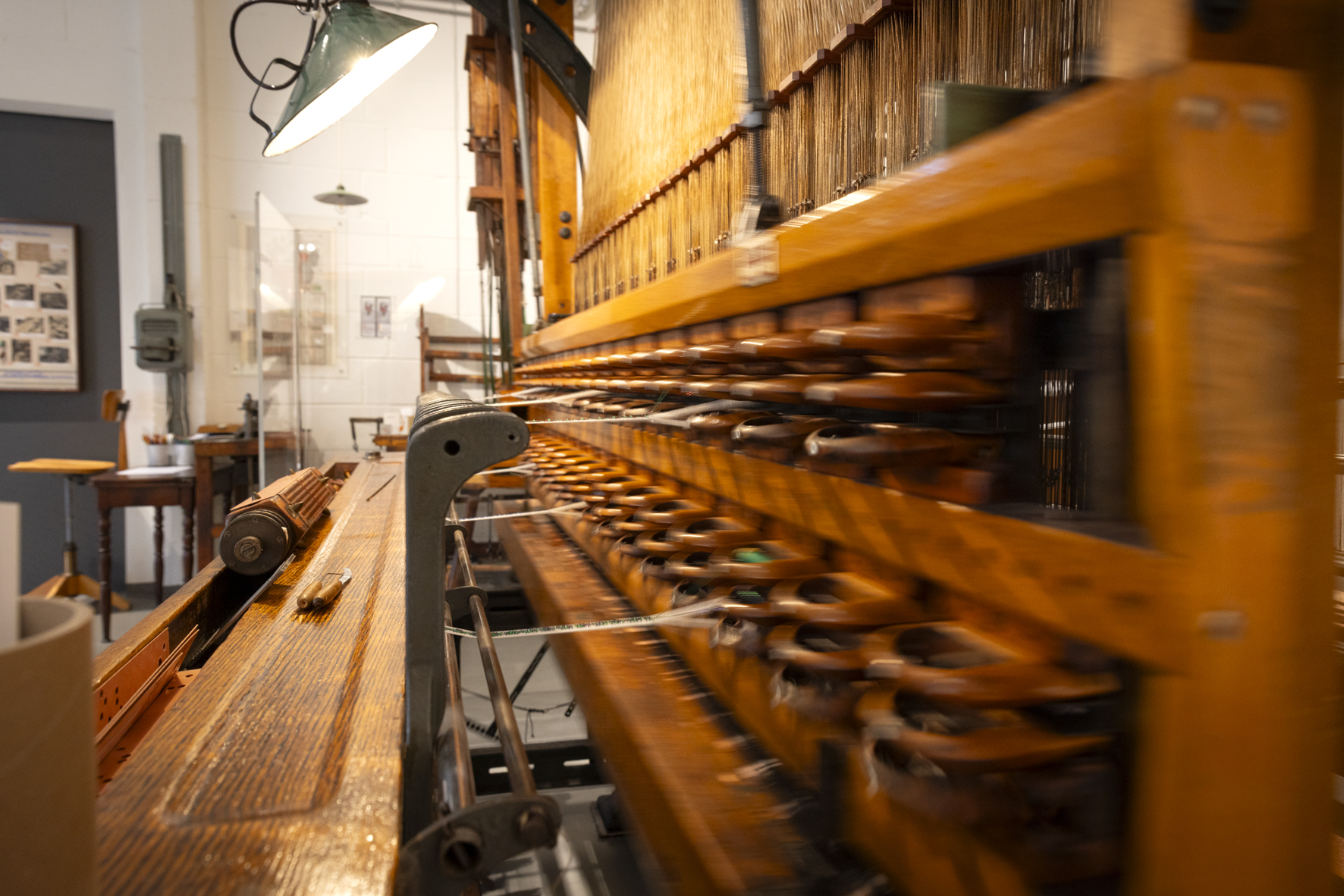 Das Bandwebermuseum ermöglicht heute einen lebendigen Einblick in über 100 Jahre Bandweberindustrie. Anfangspunkt der Ausstellung ist dabei eine stilechte Hausbandweberstube, in der die Besucher*innen am eigenen Leib erfahren können, wie die Menschen vor über 100 Jahren im heutigen Wuppertal lebten. Neben einem kleinen Holzofen, einem hölzernen Schrank und einem Tisch mit drei Stühlen ist der mit Blümchentapete eingekleidete Raum vor allem von dem Schachten-Webstuhl und den dazugehörigen Maschinen und Werkzeugen bestimmt. Werkstatt und Wohnraum sind damals untrennbar miteinander verwoben und eine strikte Trennung zwischen Berufs- und Familienleben undenkbar. Kein Wunder, denn damals halfen alle Familienmitglieder bei der Produktion der Textilien. Während die Erwachsenen am Webstuhl arbeiteten und sich um den Betrieb kümmerten, halfen ihnen ihre Kinder bereits ab drei Jahren mit einfachen Tätigkeiten bei der Fertigung der Bänder. Der hier ausgestellte Schachten-Webstuhl kam am 24. Dezember 1907 in die Familie des Vorbesitzers und wurde hier über 80 Jahre betrieben, bevor er in die Hände von Pesch und den anderen Ehrenamtler*innen übergeben wurde. In seinen besten Zeiten webte die Maschine wöchentlich bis zu 100 Meter Band pro Arbeitsstelle und produzierte damit den Lebensunterhalt der Familie. Doch die spezifische Einstellung der Maschine dauerte je nach Komplexität des zu webenden Bandes mit zwei geschulten Personen 1-3 Wochen, wobei die Zeit der Einstellung nicht bezahlt wurde. Das erklärt unter anderem die enormen Arbeitszeiten und die heute zu Recht verbotene Kinderarbeit, die zur damaligen Zeit jedoch üblich war. Wie auch alle anderen Maschinen im Museum, ist erfreulicherweise auch dieser Webstuhl funktionstüchtig. Als Pesch den Webstuhl für uns zum Leben erweckt, bebt der Boden und es wird deutlich, in was für einer Atmosphäre die Wuppertaler*innen, die damals wohlgemerkt noch keine waren, lebten. Der ohrenbetäubende Lärm der Maschine, die Takt für Takt, die Fäden zu Bändern werden lässt, ist allgegenwärtig.