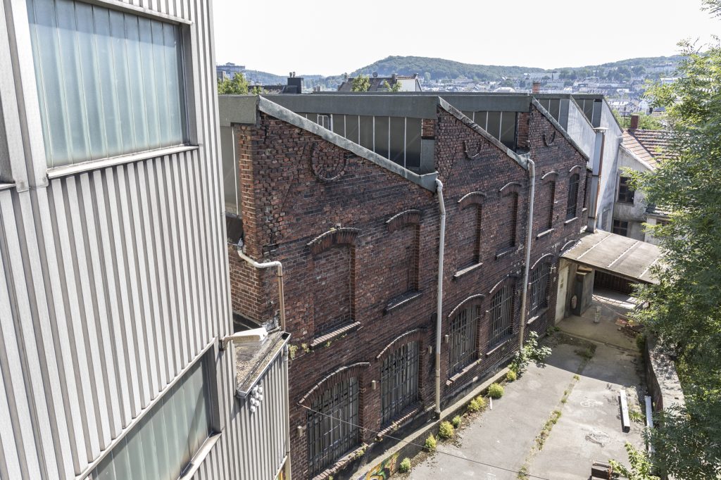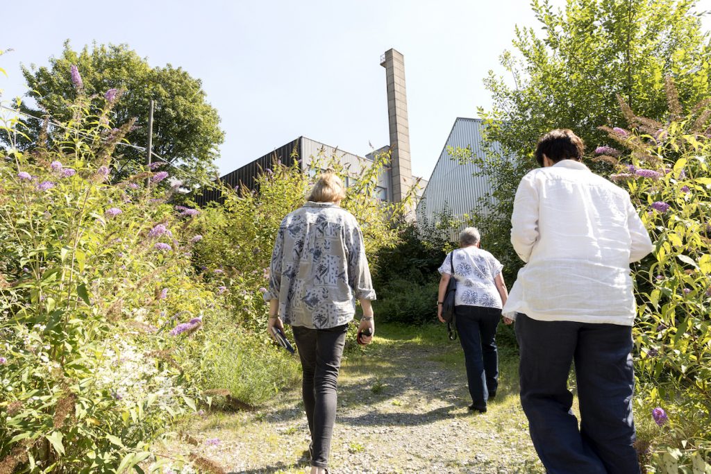 Auf einem kleinen Trampelpfad führt uns Johanna hinauf zu den ehemaligen Produktionshallen und beginnt mit ihrer Führung. Auf den Grünflächen vor dem BOB Campus wird in Zukunft in Koopertaion mit der Stadt Wuppertal ein Nachbarschaftspark errichtet. Anwohner*innen und Initiativen bekommen hier die Möglichkeit Gartenflächen für die Nachbarschaft zu bewirtschaften, Wuppertaler*innen die Natur und dessen Potential näher zu bringen und im Grünen zu entspannen. Daran angebunden ist eine mobile Quartiersküche in der die Oberbarmer*innen und Wichlinghauser*innen in Zukunft das zuvor Geerntete zubereiten und verköstigen können. Eine kleine grüne Wohlfühloase mitten im dicht bebauten Stadtteil. Außerdem wird im Rahmen der Sanierungsarbeiten ein direkter Trassenaufgang von der Wichlinghauser Straße aus entstehen, der unter anderem auch den BOB Campus mit der Nordbahntrasse verbindet.
