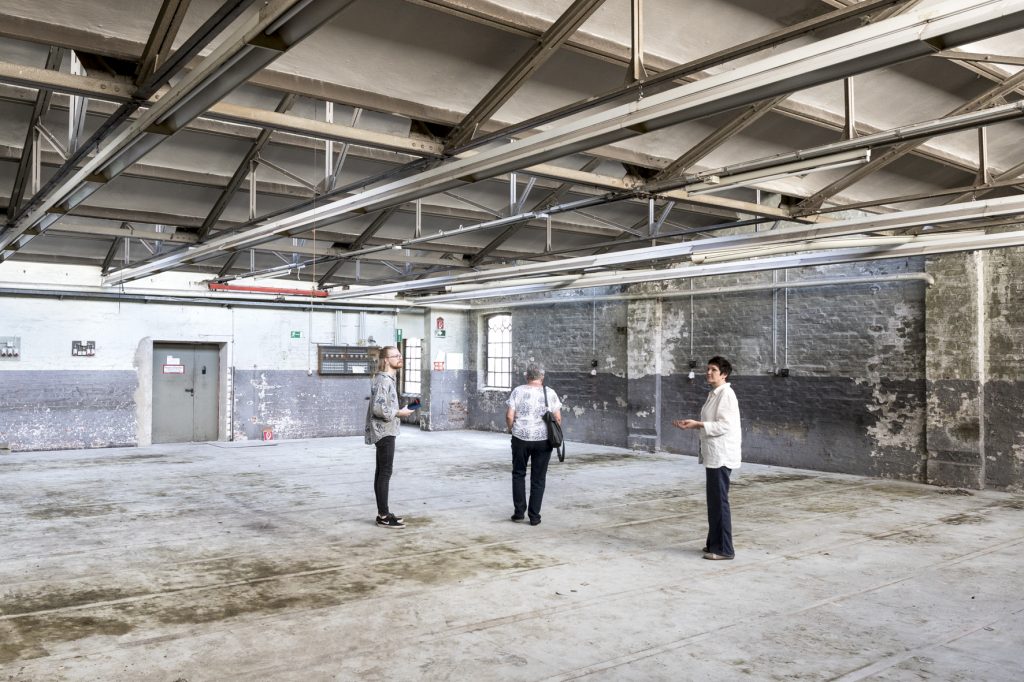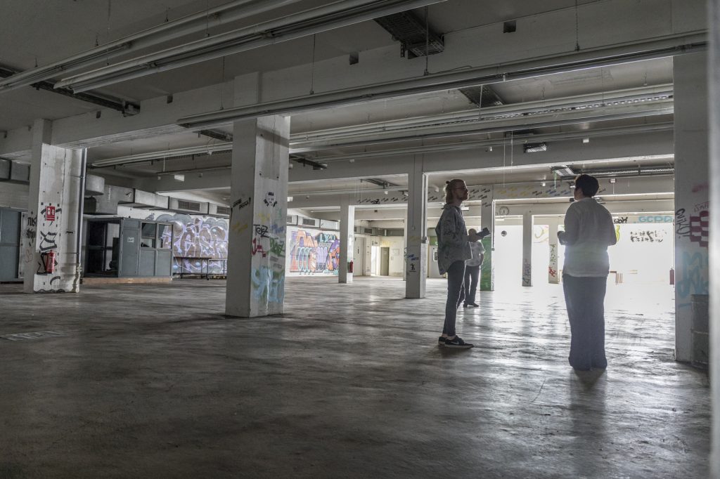 Unser Weg führt uns weiter durch die zukünftigen Campusgärten hinein in die neuere der beiden Fabrikhallen. Nachdem wir in Dunkelheit eintauchen und die Augen sich an das Schwarz gewöhnt haben, finden wir uns in einer 1000qm großen leerstehenden Halle wieder. Durchzogen von starren Betonsäulen tritt durch die alten Fabrikfenster am anderen Ende der Halle Licht in den Raum. Als Johanna anfängt zu sprechen, hallt ihre Stimme durch den Raum. Wir befinden uns in Mitten der zukünftigen Nachbarschaftsetage. Hier entsteht Raum für nachbarschaftliche Begegnung und Projekte aus dem Quartier für das Quartier. Projekte die hier realisiert werden und einen Mehrwert für die Nachbarschaft und das Quartier mit sich bringen, müssen allein die Nebenkosten für den Zeitraum der Nutzung tragen. Der Rest der versteckten Kosten wird durch die Nutzung der anderen Räumlichkeiten querfinanziert. Damit entsteht die Möglichkeit, dass die Räumlichkeiten von Nachbar*innen genutzt werden könnten, die sich den Raum auf Grund der Miete eigentlich nicht leisten könnten.