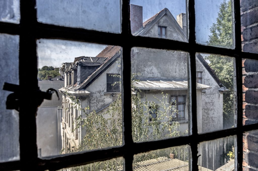 Aus dem benachbarten Fenster kann man einen Blick auf die dazugehörigen Wohnhäuser erhaschen. Bevor die Projektgesellschaft anfing das Gelände zu entwickeln wohnten noch zwei ehemalige Arbeitnehmer*innen in den Häusern. Der Rest der Wohnungen stand leer. Als früherer Mitarbeiter*innen der Firma Bünger Textilien überdauerten sie die Insolvenz der Firma. Im Rahmen eines Kunstprojekts der „Mobilen Oase“ wirkten sie bei einer Führung durch die Hallen mit Erfahrungsberichten mit. Inzwischen haben sie dank der Hilfe des BOB eine neue Wohnung im Quartier gefunden. Das war auch zwingend notwendig, denn die Wohnungen befinden sich in einem maroden, unbewohnbaren Zustand. Während der Sanierung sollen hier mit Hilfe von Wohnungsförderung 12 Wohnungen in verschiedenen Größen entstehen. Dadurch werden die Räumlichkeiten auch in Zukunft erschwinglich für Rentner*innen, Familien und Studierende.