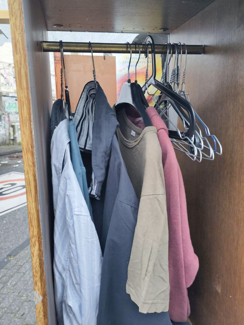 Aber was genau kann man sich unter einem Tauschwagen vorstellen? Ein Tauschwagen ist ein wetterfester Schrank, der an einem rege genutzten Ort installiert wird und von den Passant*innen mit Gegenständen gefüllt wird, die sie selbst nicht mehr brauchen, allerdings zu schade sind, um sie wegzuschmeißen – Kleidung, kleinere Haushaltsgegenstände, Geschirr, Bücher. Grundsätzlich kann in einem Tauschwagen alles hinterlegt werden, was nicht gekühlt werden muss und in den Schrank passt. Zeitgleich können Passant*innen sich auch die Dinge mitnehmen, die sie selbst benötigen. Klingt trivial, ist aber folgenreich. Denn die Tauschwägen sind eben nicht nur kollektive Abstellkammern, sondern unkomplizierte und niedrigschwellige Orte der gesellschaftlichen Interaktion. Der Tausch von Gegenständen wird dabei nicht durch eine Machtdynamik vermittelt, in der etwa, wie herkömmlich, Geld gegen Gegenstände getauscht wird, oder Gegenstände auf paternalistische Weise verschenkt werden. Stattdessen findet dieser Tausch unvermittelt und hierarchiefrei statt. Die Tauschwägen helfen somit dabei, der sich reproduzierenden Wegwerfgesellschaft entgegenzutreten. Darüber hinaus erfüllen die Tauschwägen auch einen sozialen Zweck. Während Inflationsraten steigen, eine angemessen geheizte Wohnung für viele nicht mehr als reale Option existiert und Fahrkartenpreise für den öffentlichen Nahverkehr nicht erschwinglich sind, haben Menschen zumindest auf der Straße einen Ort, an dem sie notwendige Gegenstände finden können: „Wir denken, sowas ist notwendig, um 1. einen Gegenentwurf zur Wegwerfgesellschaft zu haben und 2. Leute im Viertel zusammenzubringen – Tauschwägen als Begegnungsstätte, gegen Vereinzelung und den ganzen Mist“, so das Kollektiv.