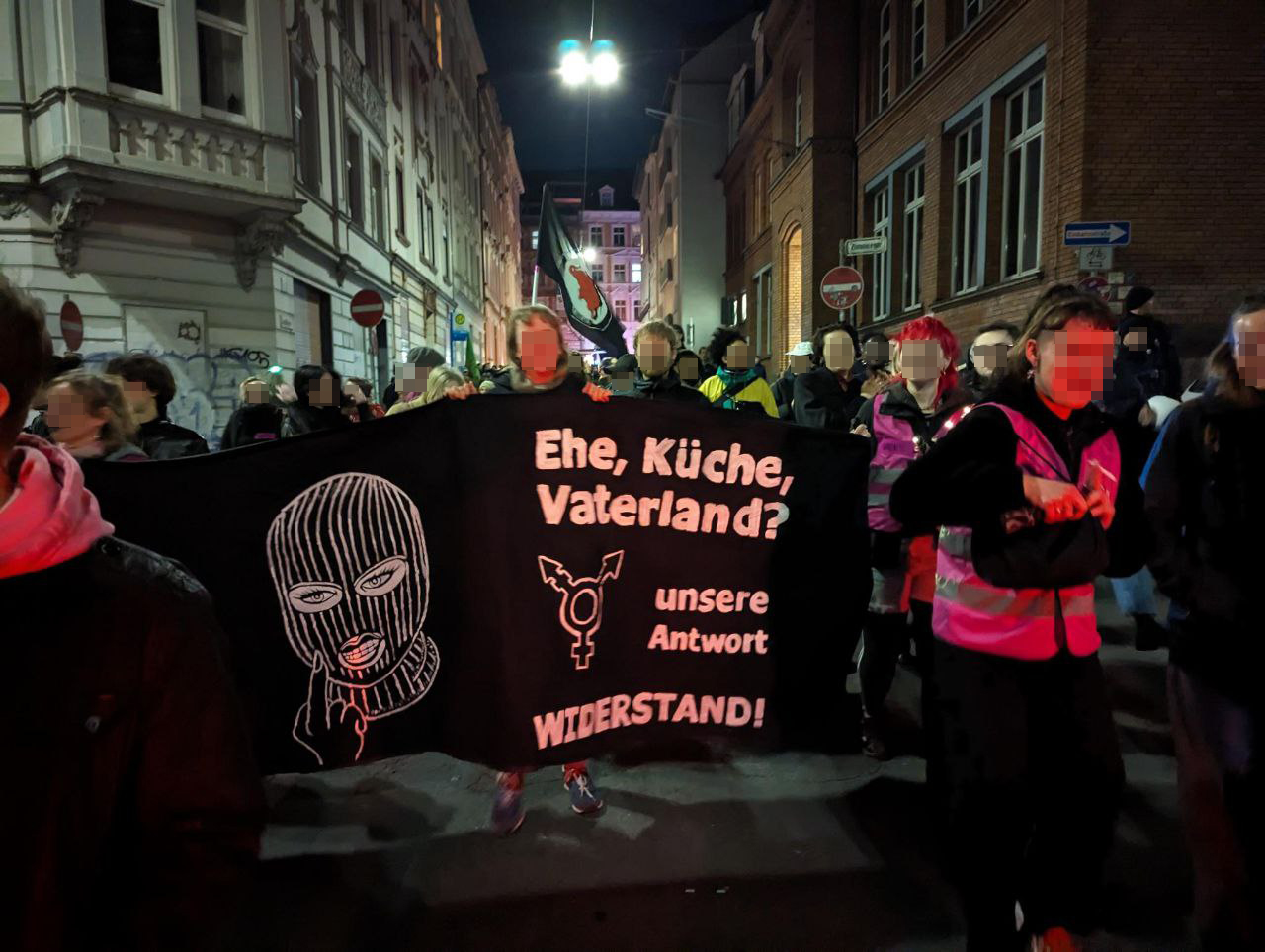 Am 8. März zogen auch in Wuppertal, anlässlich des feministischen Kampftages, zahlreiche Demonstrierende in einer unüberhörbaren Tanz-Kampfdemo durch die Elberfelder Nordstadt. Rund 300 Demonstrierende folgten dem Aufruf des „Bündnis 08. März Wuppertal“ und tanzten in euphorischer Stimmung hinter dem Lautsprecherwagen her, auf dem das Künstler*innenkollektiv PRUDE und die Künstlerin Pyya ein abwechslungsreiches Programm elektronischer Tanzmusik präsentierten. Diejenigen, die nicht auf der Straße tanzten, standen an ihren geöffneten Fenstern entlang der Demoroute und schauten auf die Straße. Manche wirkten irritiert und ratlos, andere winkten den Demonstrierenden zu. Technisch bedingte Musikpausen wurden mit lauten Sprechchören überbrückt. Durch die engen Altbaustraßen hallten Parolen wie: „However I dress, wherever I go: Yes means Yes and No Means No“ (Egal wie ich mich kleide, egal wohin ich gehe: Ja heißt Ja und Nein heißt Nein), „Alerta Alerta Queerfeminista!“ und „Macker raus!“. Am Schusterplatz angekommen, legte die Demonstration eine kleine Pause ein – es gab Tee, Kekse und Redebeiträge über die kurdische Frauenbewegung in Rojava, Kritik an der Umsetzung des Selbstbestimmungsgesetzes, das im November 2024 das bestehende „Transsexuellengesetz“ ablösen wird, und die Zwangsverheiratung von Mädchen. Die Stimmen aus dem Lautsprecherwagen dröhnten über den Platz, in den Redepausen wurde applaudiert. Inzwischen war es dunkel geworden und die Demo bewegte sich über die Karlstraße und Gathe zum AZ, wo der tanzende Demonstrationszug mit einem kleinen Feuerwerk begrüßt wurde. Der 08. März endete in Wuppertal mit einer Party im Autonomen Zentrum, bei der die Rapperin Ket und die DJs Shamey Oliver, Scheidi Klum und Maruhni für ausgelassene Stimmung sorgen.