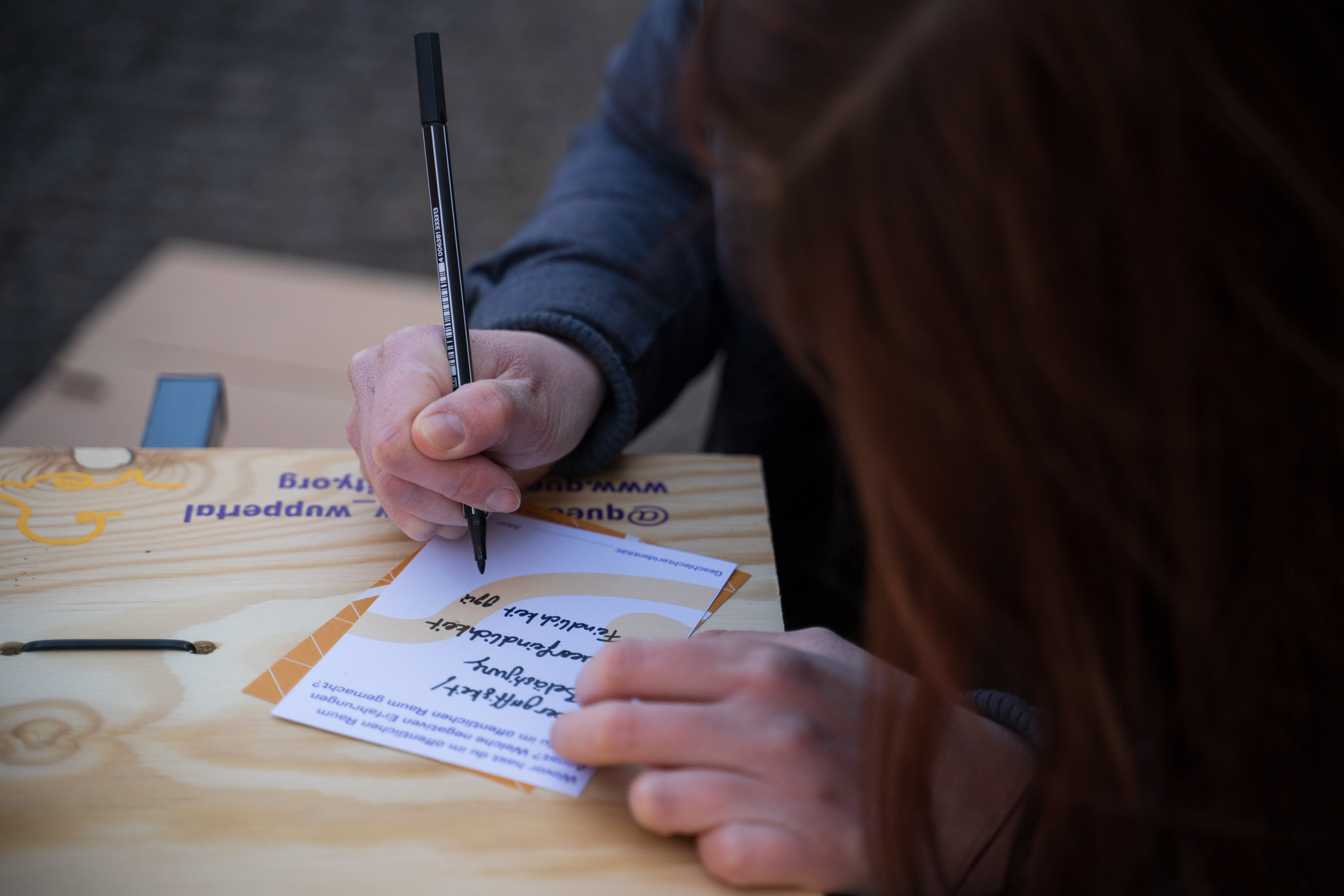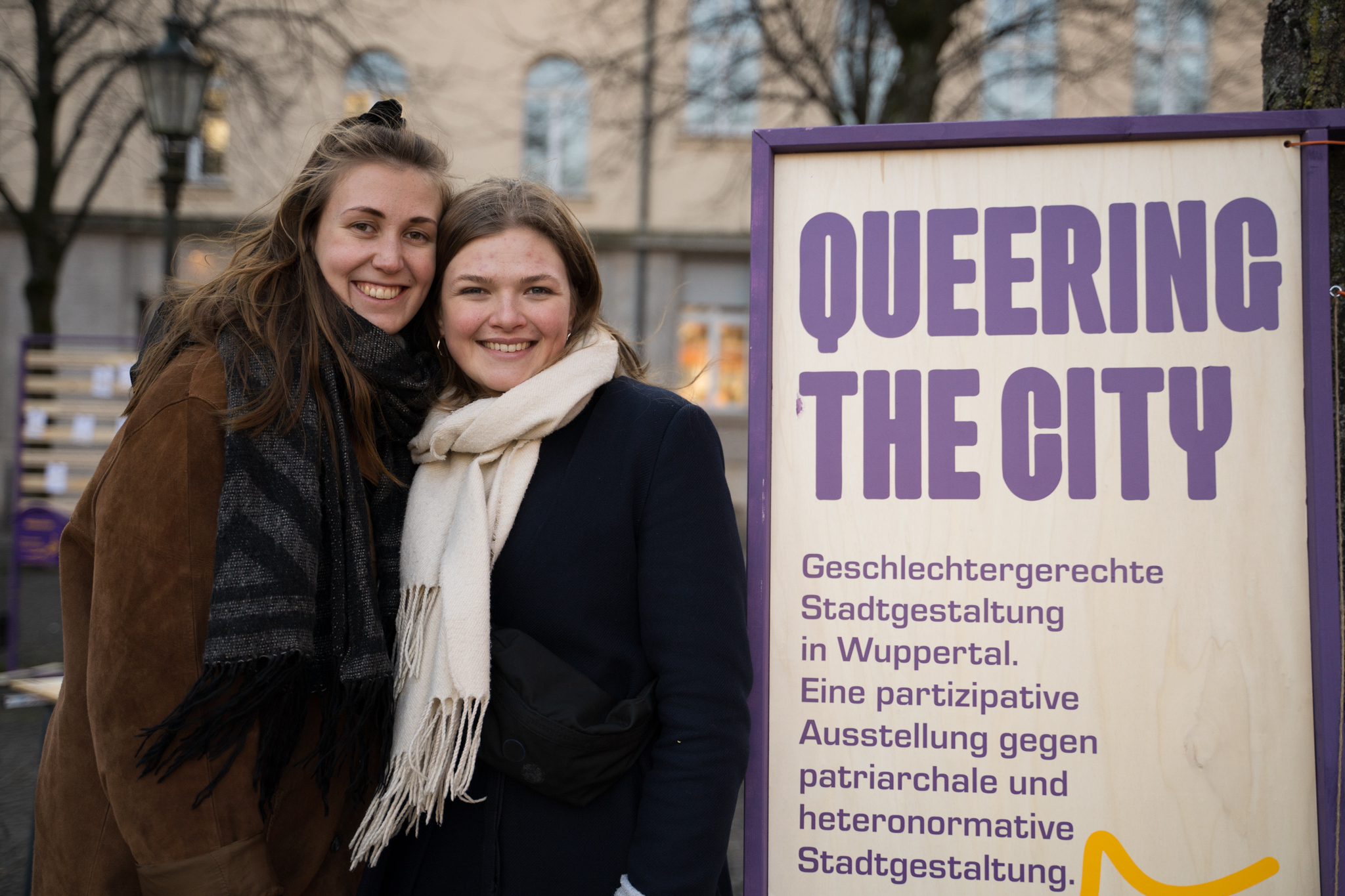 Kira und Anna zeigten im Rahmen der Ausstellung dafür zahlreiche Beispiele: die Gestaltung öffentlicher Toiletten, Straßennamen, Angsträume und Straßenbeleuchtung, Erreichbarkeit von Versorgungsstrukturen, öffentlicher Nahverkehr, Aufenthaltsräume … . Die Liste ist lang. Grund für die diskriminierende und ausschließende Gestaltung öffentlicher Räume ist unter anderem auch, dass die Stadtplanung noch immer recht fest in den Händen weißer cis (Menschen die sich dem Geschlecht zugehörig fühlen, das ihnen bei der Geburt zugewiesen wurde) Männer liegt und damit nur wenig Variation von Perspektiven abseits männlicher Blicke offenbart wird. Das Ziel von „queering the city“ ist daher einen ersten Schritt zu wagen und genderdiskriminierende Aspekte in der Stadtgestaltung von Wuppertal öffentlich aufzudecken. Nur wenn wir Sichtbarkeit für Probleme schaffen, können wir auch Räume zum Diskutieren und Verändern öffnen. Um dieses Vorhaben zu realisieren, sammelten Kira und Anna am 8. März konkrete Meinungen, Erfahrungen und Geschichten von Wuppertaler*innen. Die Ergebnisse dieser Erhebung sollen, zusammen mit weiteren recherchierten Einblicken, am 21. April um 11 Uhr und um 16 Uhr in einem jeweils ca. 1,5h langen Stadtspaziergang dargeboten werden und den Blick für heteronormative Stadtgestaltung schärfen. Ende des Jahres sind zudem Workshops geplant, die die Thematik nochmals umfassender behandeln.