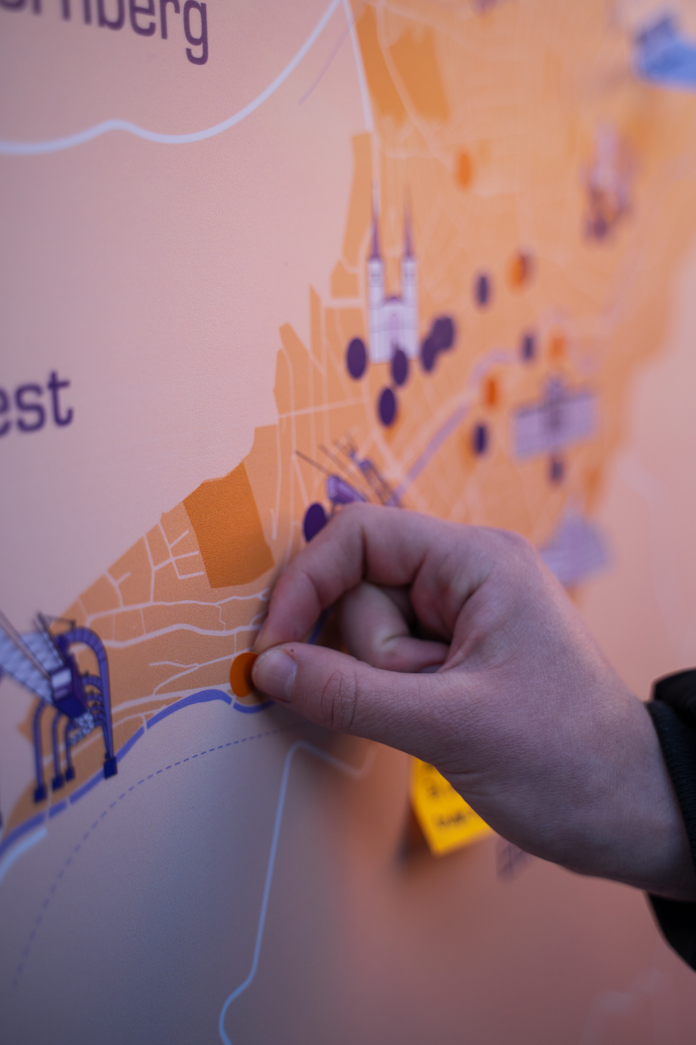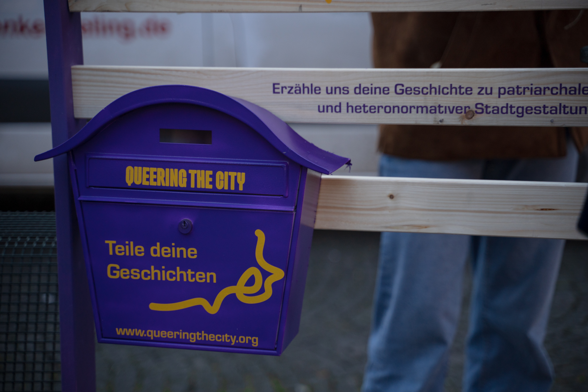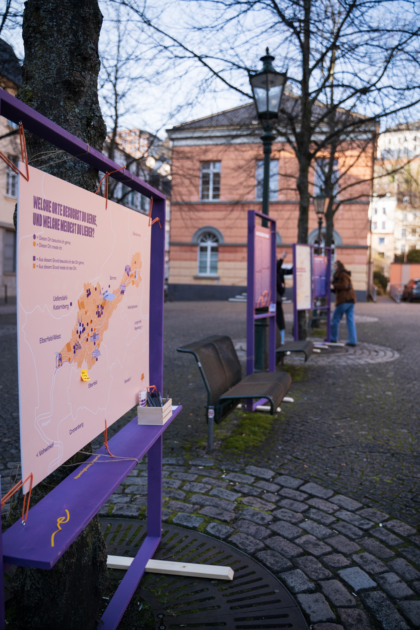 Aber das Patriarchat ist auch abseits von gewaltvollen menschlichen Interaktionen in unseren Alltagen präsent – nämlich in den urbanen Räumen, in denen wir uns bewegen. Das macht die partizipative Ausstellung des gleichnamigen Projekts „queering the city“ klar, die am 08. März von 11 bis 18 Uhr auf dem Laurentiusplatz besucht werden konnte. Das Projekt wird von Anna und Kira, zwei Public Interest Design Studierenden an der Bergischen Universität Wuppertal organisiert und durchgeführt. Zuvor hatten sie eine queer-feministische Stadtkarte von Wuppertal – „Stadtkaleidoskop“ [HOMEPAGE] – erarbeitet und veröffentlicht. In „queering the city“ setzen sich Anna und Kira jetzt mit den konkreten städtischen Strukturen und Räumen auseinander, in denen wir leben. Denn obwohl Wuppertal eine geschichtsträchtige Stadt ist, die von differenten Lebensrealitäten nur so strotzt, sind nicht alle Geschichten auch gleichermaßen repräsentiert. Das Stichwort lautete „heteronormative Stadtgestaltung“. Damit ist gemeint, dass die Stadtgestaltung auf einer binären Norm basiert, die immer schon annimmt, dass es nur zwei Geschlechter gäbe und diese auf sich bezogen sind. Samt des Rattenschwanzes des Patriarchats werden damit Perspektiven von queeren Personen und FLINTA* von vorneherein übergangenen und städtebauliche Realitäten erschaffen, die Lebensrealitäten ausschließen. Aber wie konkretisiert sich das genau?