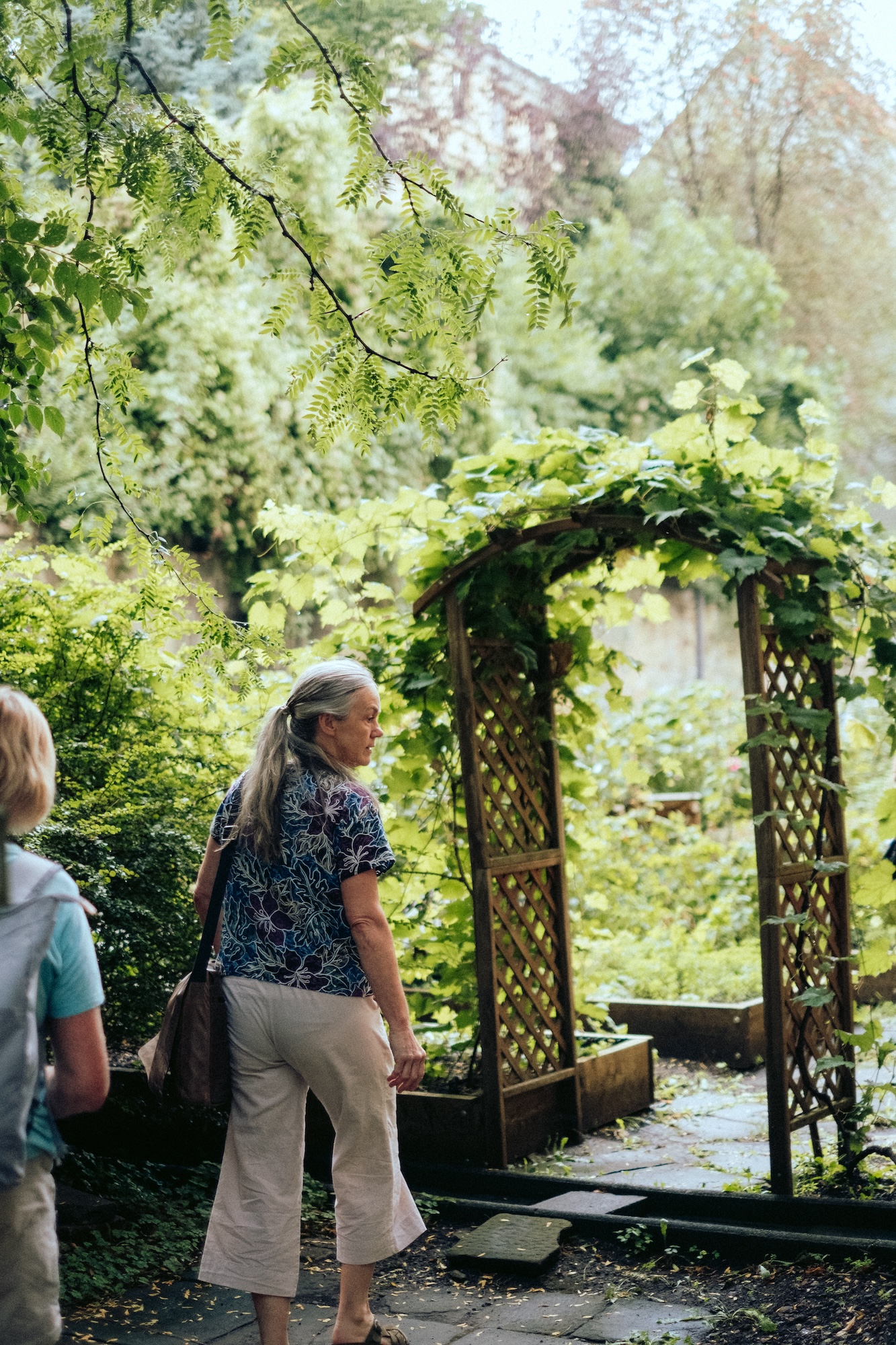 Auch unser zweiter Grüne-Wege-Spaziergang beginnt wieder bei der Kreuzkirche. Das Eingangstor zum Kirchgarten ist schon am späten Nachmittag verschlossen, wir überwinden den recht niedrigen Zaun und durchwandern den Garten um die Kirche herum. Der Garten ist ein zauberhafter Ort, aber schade, dass dieser nicht für die Anwohner*innen im Quartier zugänglich ist. Die seinerzeit mit Geldern aus dem Mitmachfonds angeschafften Bänke stehen aktuell nutzlos im Inneren der Kirche herum – mehr oder minder versteckt. Auf Nachfrage bei dem jetzt dort angesiedelten Sozialkaufhaus der Diakonie besteht leider nicht die Absicht, den Gartenbereich für einen ruhigen und im Sommer schön schattigen Aufenthalt zu öffnen.