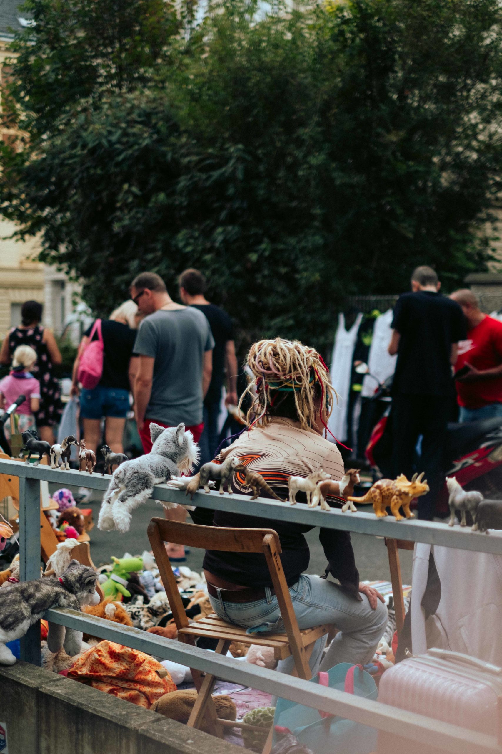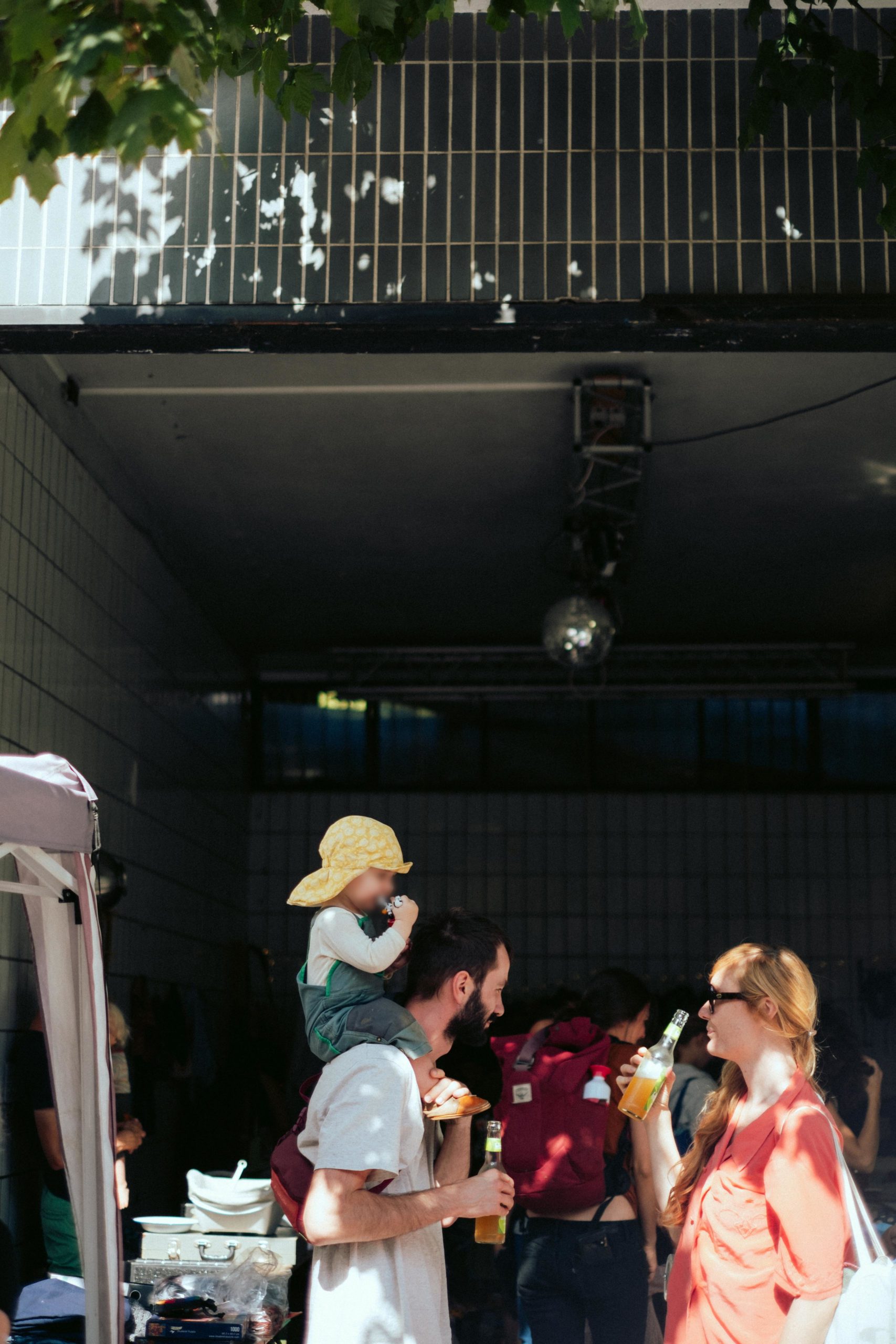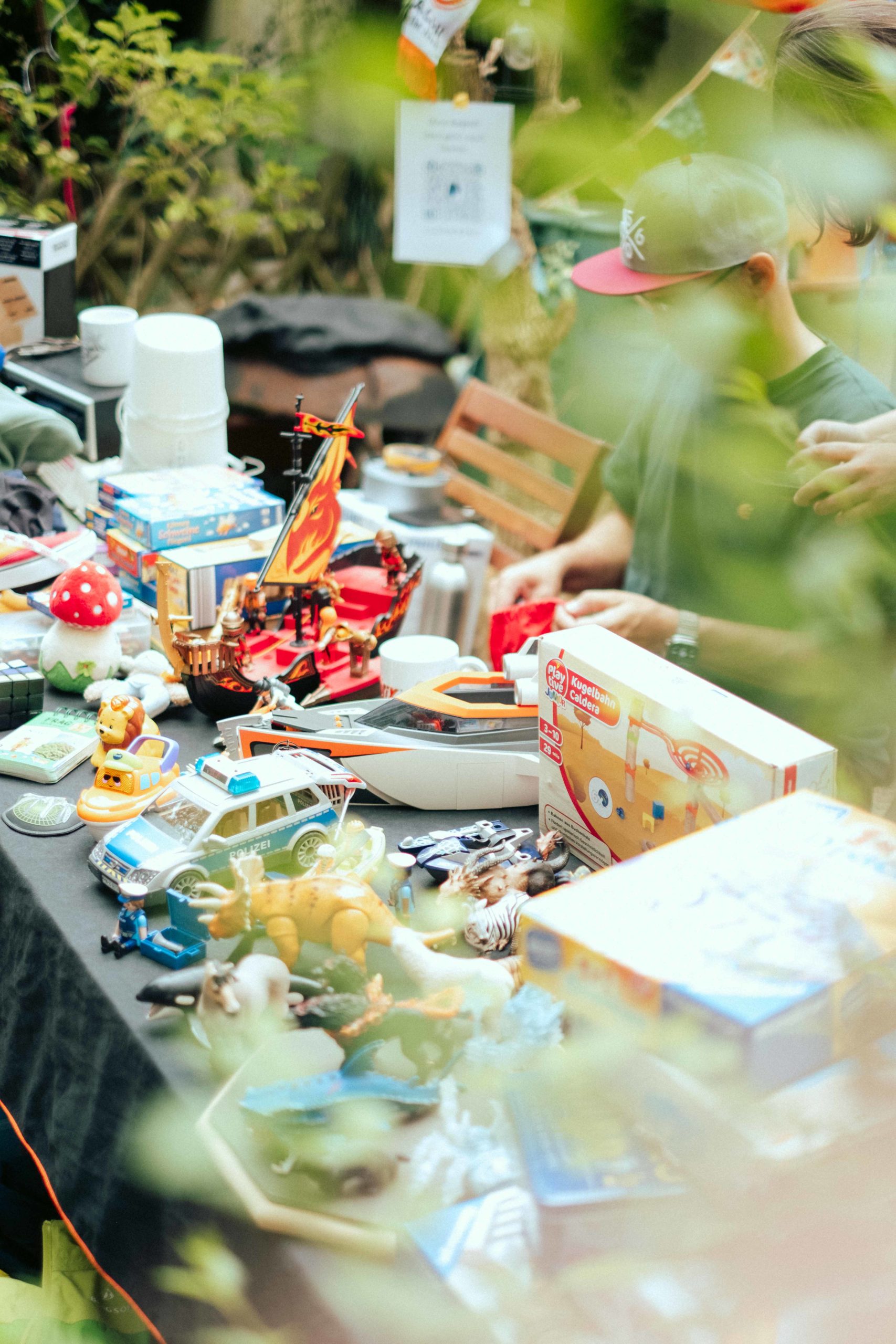 Ein leichter Luftzug zieht durch die Straßen. Kinder sitzen auf der steinernen Fensterbank eines ehemaligen Ladenlokals und verkaufen altes Spielzeug. Menschen stehen auf dem Bürgersteig, essen Pommes und unterhalten sich. In einem Hinterhof thront ein steinerner Elefant, dessen Preis verhandelbar ist. Nur wenige hundert Meter weiter bietet ein Kind selbstgebastelte Kastanienfiguren und alte Bücher an. An der Hausfassade hängt ein handgeschriebener Zettel, auf dem „Olek“ den Flohmarkt ankündigt. „Top-Adresse“. Gelbe Postboxen voller Bücher säumen eine backsteinerne Wand. Musik schallt durch die Straße und wird von lautem Lachen unterbrochen. Kinderkleidung, neben Spielsachen, neben Büchern. Zwei bunte Teppiche mitten auf einem fast vergessenen Platz. Stöbernde Gesichter zwischen Vintage-Kleidung für ein paar Euro. Bei den Nachbarn gibt es selbstgebackenen Kuchen und gezuckerten Çay. „Smash“. Über die Freifläche dröhnt elektronische Musik. Klebrige Finger von geschmolzenem Zitroneneis. Ein hechelnder Hund kühlt sich im Schatten ab. Zwei Menschen zeigen sich lachend ihre Flohmarktfunde.