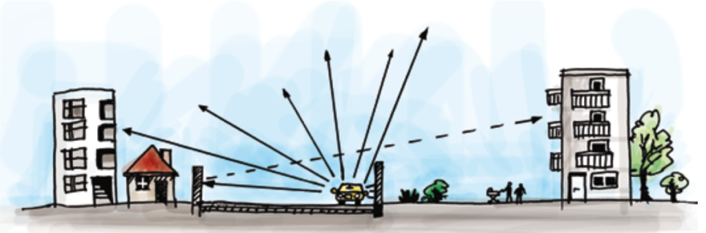 Beispiele für Lärmschutzwände und Lärmschutzwälle gibt es zahlreich. Die Wahl eines Lärmschutzwalls kann im Fall der A46 jedoch mit Sicherheit ausgeschlossen werden, da die dafür erforderlichen Flächen fehlen. Aber auch Lärmschutzwände haben in Wuppertal so ihre Tücken. Die Hanglage, an der die A 46 entlang geführt wird, reduziert die Schutzwirkung von Lärmschutzwänden enorm. Die Schallwellen, die in dem Bild als Pfeile dargestellt sind, finden ihre Wege über die Wände hinweg und tragen die Lärmemissionen somit über die Autobahn hinaus in umliegende Wohngebiete, wie das Mirker Quartier. Auch können Lärmschutzwände an sehr nahen an der Autobahn stehenden Gebäuden zu einer erhebliche Verschattung der Wohnungen führen.