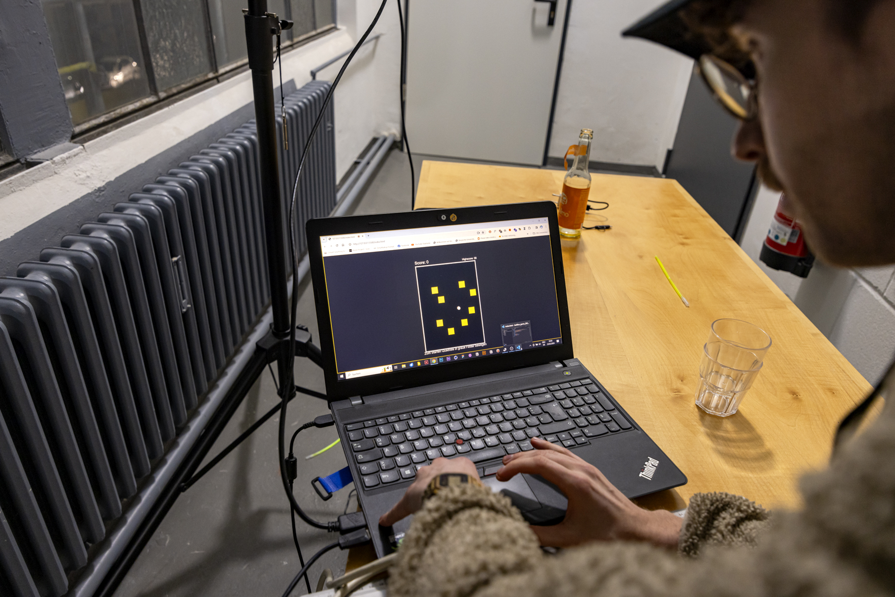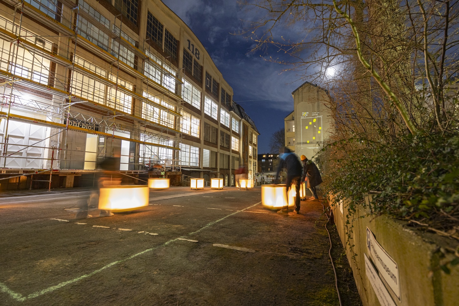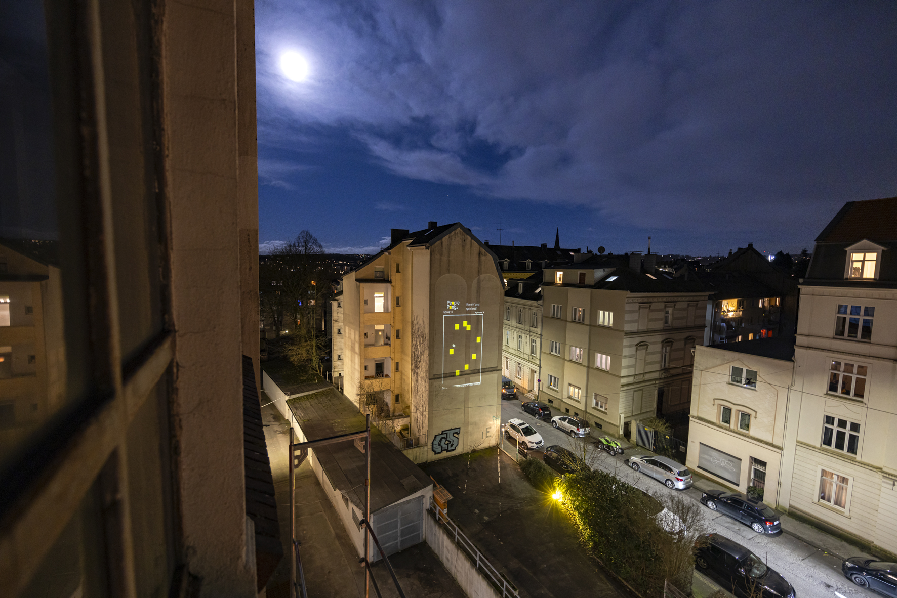 Bereits am vergangenen Samstag (17. Februar 2024) konnten Passant*innen und Nachbar*innen auf dem Grundstück der Wiesenwerke [Link] ein visuelles Spektakel erleben. Menschen schoben leuchtende Würfel über den dunklen Vorplatz, während auf der benachbarten Hauswand eine Fläche projiziert wurde, auf der gelbe Kästchen einen Ball davor bewahrten, das Spielfeld zu verlassen. Grund für diese ungewöhnliche Szenerie ist das Projekt „People Pong“ von Marvin Link. Als Masterstudent des Public Interest Design möchte er mit dem Projekt spielerisch Momente der Begegnung im Quartier schaffen.