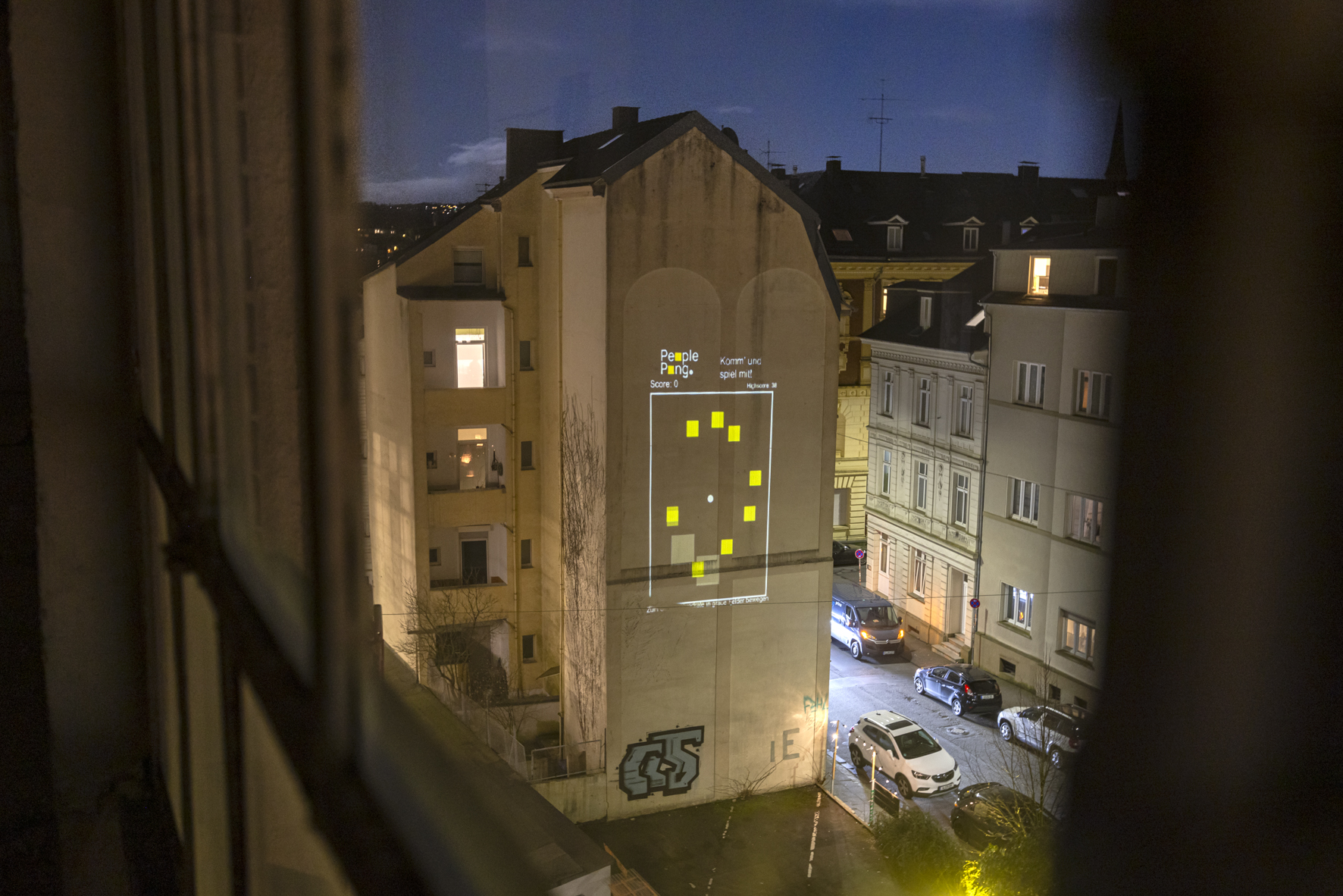 People Pong ist kein schweres Spiel. Auf dem Spielfeld, in diesem Falle der Fläche vor den Wiesenwerken, stehen mehrere warm leuchtende Würfel, die sich über den ehemaligen Parkplatz rollen lassen. Werden die Würfel bewegt, so bewegen sich simultan auch ihre virtuellen Doppelgänger auf der benachbarten Hauswand. Dort ist zusätzlich ein virtueller Ball zu sehen, der von den Würfeln abprallt. Ziel des Spiels ist es durch geschicktes Verschieben der Würfel zu verhindern, dass der Ball das Spielfeld verlässt. Was auf den ersten Blick simpel erscheint, gestaltet sich in Wirklichkeit etwas schwieriger – denn es ist unmöglich People Pong alleine zu bestreiten. Zu groß ist das Spielfeld, zu zahlreich sind die Würfel, die verschoben werden müssen. Erst wenn Mitspieler*innen sich der Bewegung der anderen Würfel widmen, kann es durch ein geschicktes und kooperatives Miteinander gelingen, den Ball langfristig im Spielfeld zu halten. Und die Moral der Geschichte? Zusammen ist (fast) alles leichter!