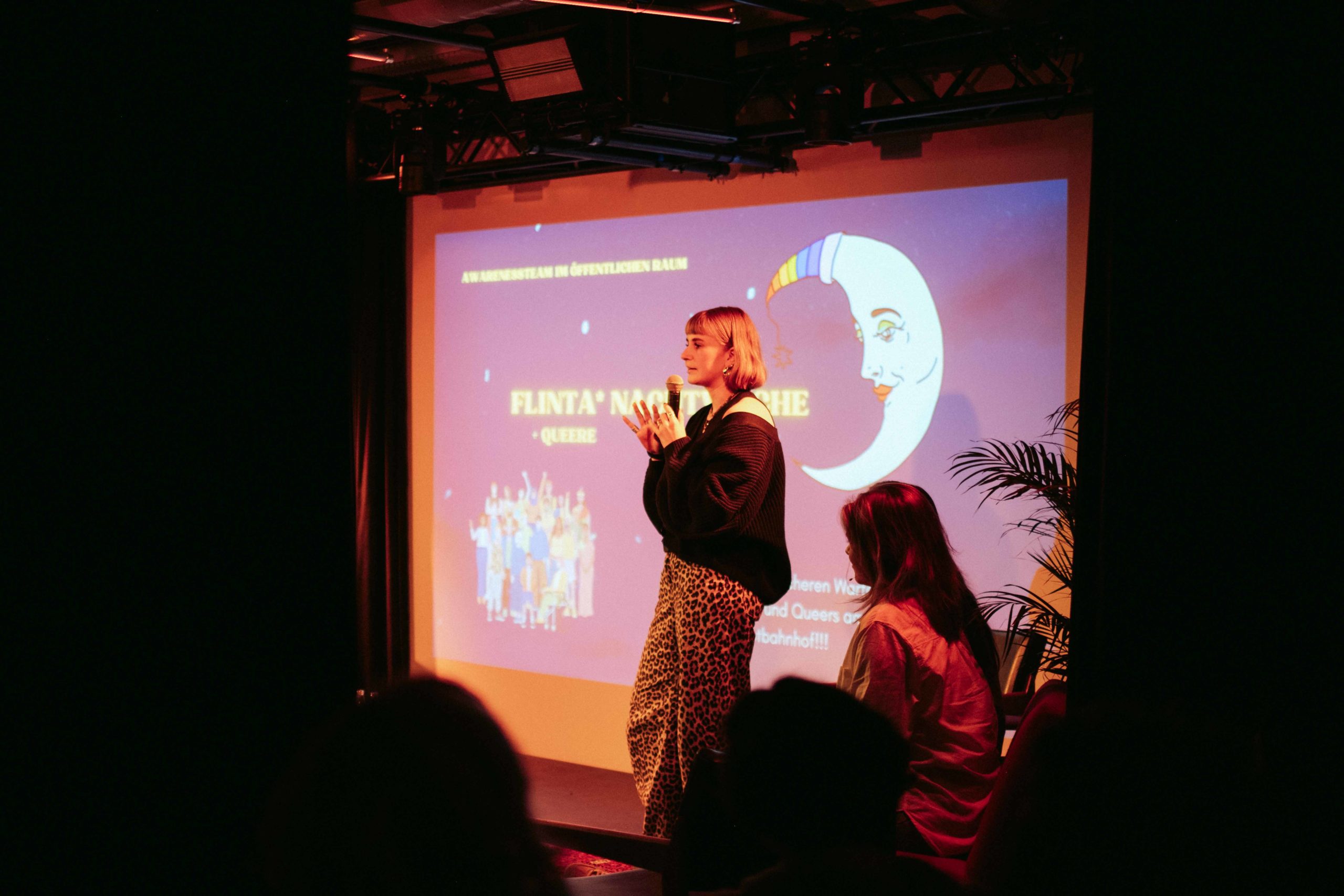 Um sich der Realisierung einer geschlechtergerechten Stadtgestaltung anzunähern haben Kira und Anna sich im Rahmen eines Workshops zwei Wochen vor der Podiumsdiskussion mit Teilnehmer*innen mit konkreten Anliegen in Wuppertal beschäftigt. Gemeinsam haben sie mit einer macht- und diskriminierungskritischen Perspektive die Stadt erkundet, Barrieren identifiziert und in Kleingruppen kreative Lösungsideen entwickelt, wie diese Hindernisse abgebaut werden können. Darunter z.B. das Projekt von Jana, die gemeinsam mit weiteren Teilnehmer*innen die Idee eines Awarenessteams entwickelt hat, das dem Sachverhalt entgegnen soll, dass FLINTA-Personen im öffentlichen Raum besonders nachts Opfer von Gewalt werden und viele Räume mit Angst und Gefahr assoziiert werden. Ein Awarenessteam könnte z.B. am Wuppertaler Hautbahnhof als feste Ansprechstruktur fungieren, um Übergriffe zu verhindern und ein Gefühl der Sicherheit zu verankern. Da diese Idee jedoch mit erheblichen Kosten und Personalaufwand verbunden ist, haben die Teilnehmer*innen zudem die Idee entwickelt, dass am Hauptbahnhof ein Ort markiert werden könnte, an dem sich FLINTA-Personen nachts bei der Durchreise gemeinsam versammeln können, um einen sichereren Raum zu gestalten. Diese und viele weitere Projektideen sind an diesem Abend im Rahmen einer Ausstellung im LOCH einsehbar.