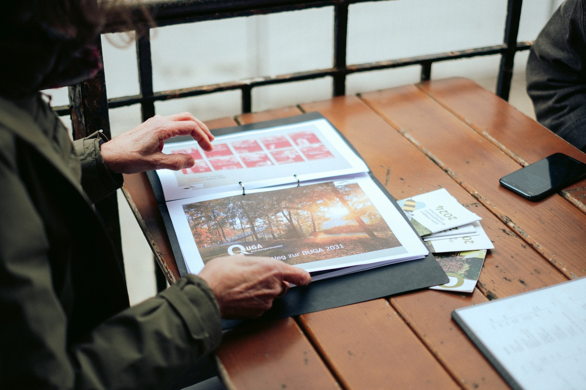 Im Gegensatz zur BUGA, deren Möglichkeiten vor allem von einem weitläufigen finanziellen Budget bestimmt werden, lebt die QUGA von der Beteiligung der Bewohner*innen der ausrichtenden Quartiere. Denn zentraler Bestandteil der QUGA ist die Zusammenarbeit mit lokalen Akteur*innen und Initiativen, die bereits in den jeweiligen Quartieren etabliert sind, über ortsspezifische Expertisen verfügen und bereit sind, diese in vielfältigen Veranstaltungsformaten zu präsentieren. Im Fokus steht dabei die Praxis des Entdeckens, des Pflegens, des Wertschätzens und der Inszenierung der lokalen Grünflächen. Jede dieser Tätigkeiten kann weitläufig interpretiert werden und z. B. in Form von Führungen, gemeinsamen Spaziergängen/Sportaktionen, geplanten Arbeitseinsätzen, Aufräumarbeiten, Vorträgen, Ausstellungen, Konzerten oder Lesungen vollzogen werden. Solange sich die Formate im weitesten Sinne mit den Grünflächen des Quartiers beschäftigen, oder in ihnen veranstaltet werden, können sie Teil des Programms werden. Den Rahmen des Ausmaßes bestimmt das Quartier selbst. Antonia berichtet davon, dass die damit einhergehende Vernetzung lokaler Initiativen in den letzten Jahren dazu führte, dass etwas Neues entstand, das den Zeitraum der QUGA überdauert: Sei es ein ehrenamtliches Café als Treffpunkt, eine Vernetzung der lokalen Urban-Gardening-Projekte oder Kooperationen zwischen Schulen und ehrenamtlichen Initiativen. Die QUGA ist damit nicht bloß als „simple“ Gartenausstellung zu verstehen, die neue Landschaftsplanungsprojekte realisiert, sondern in erster Linie ein Anlass zur Auseinandersetzung mit den umliegenden Grünflächen und ein Impuls zur Vernetzungsarbeit, die es Akteur*innen ermöglicht, zusammenzukommen und über gemeinsame Ideen, Probleme und Strukturen ins Gespräch zu kommen.