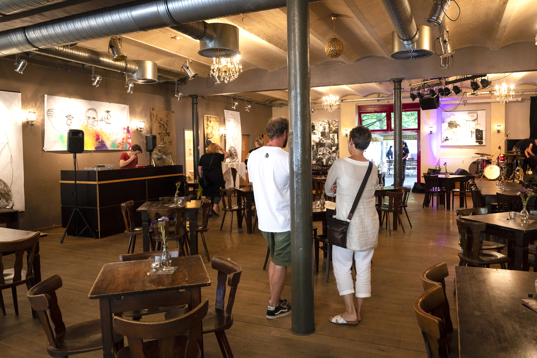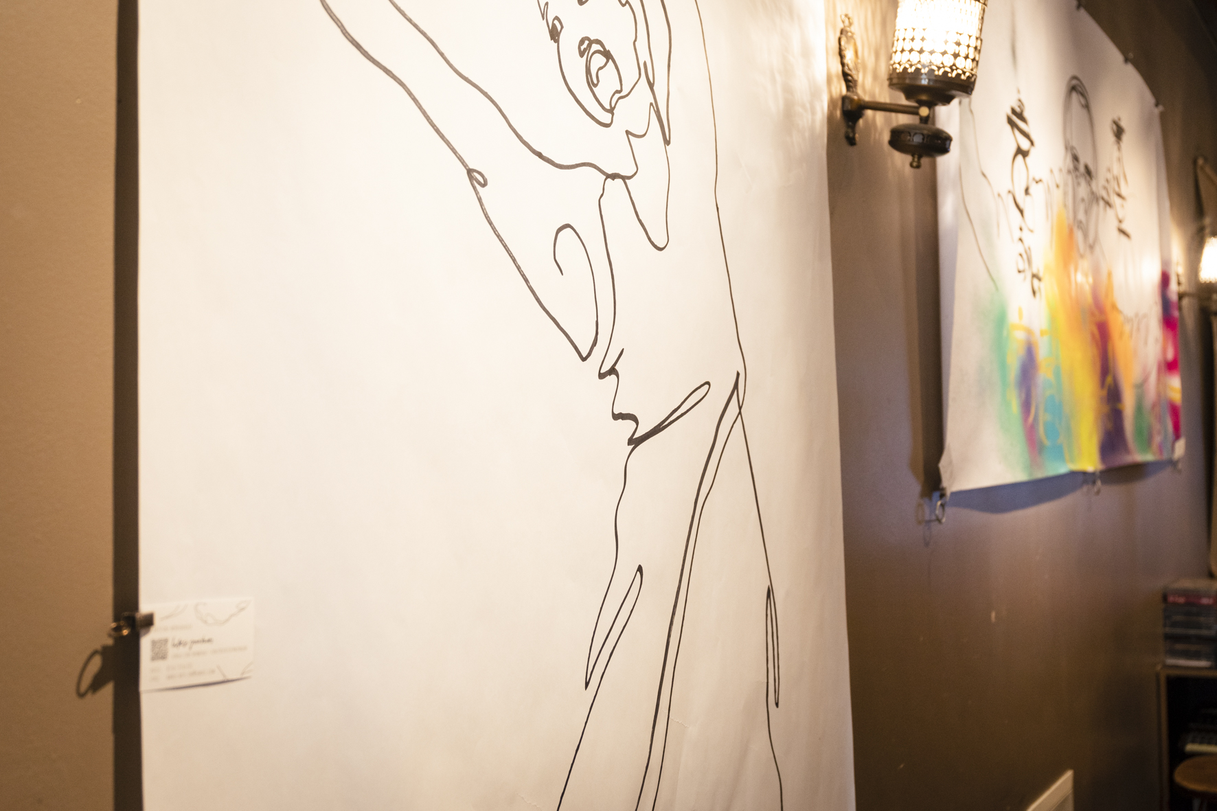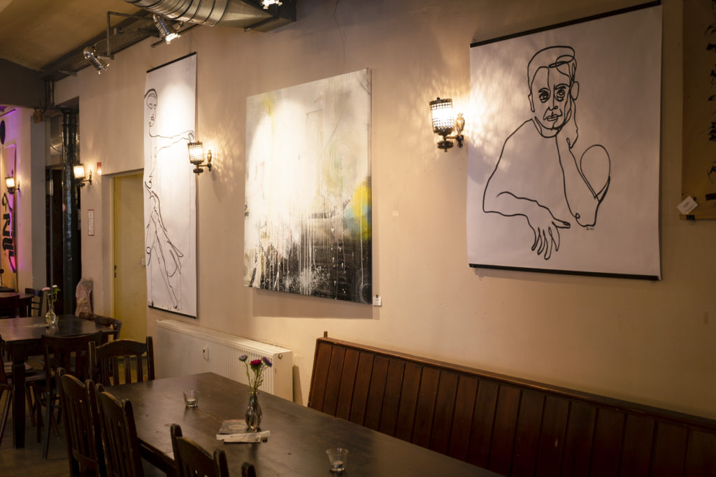 Wie treffen nun zwei solch unterschiedliche Künstler*innen aufeinander? Und welche neuartigen Elemente entspringen aus ihrer Kollaboration? Die beiden lernten sich bei einer gemeinsamen Ausstellung im Rahmen der WOGA 2021 in den Breuer-Höfen kennen und entschieden sofort, dass sie zukünftig gerne gemeinsam arbeiten wollen. Aus dieser Begegnung und dem Wunsch ging die Ausstellung »Resonanzen« hervor, die zum jetzigen Zeitpunkt im Café ADA auf der Wiesenstraße zu besuchen ist. Kunst schaffen ist in den meisten Fällen keine bloße Abhandlung einer Anleitung. Vielmehr lebt Kunst von Muße, von Improvisation und Gefühl, und somit auch von individuellen Abläufen, die Kunstschaffende durchlaufen und konstruieren. Wenn diese verkörperten Cluster aufeinander treffen, dann ist der Moment des Aufprallens in jedem Fall ein interessanter – aber längst nicht immer auch ein produktiver. Bei Christine Mühlberger und le dudds hingegen war es ein wahrer Volltreffer. Nicht nur die menschliche Sympathie spielte dabei eine Rolle, sondern auch ein symbolischer Schaffensprozess, der die Zusammenarbeit der beiden Kunstschaffenden ausmacht und ein symbiotisches miteinander erschafft. Und das, obwohl die beiden komplett unterschiedliche Herangehensweisen an ihr eigenes Schaffen verfolgen. Während Christines „one-liner“ in den meisten Fällen von einer gewissen Referenz ausgehen, verfolgt le dudds einen impulsiven und emotionalen Ansatz. Die Impressionen fließen also in Christines Hand, um wieder aus ihrer Hand hinauszufließen. Aus le dudds hingegen plätschert es nur so heraus. Eher impulsiv oder vielmehr inspiriert – die Kollaborationen zeigt eine Bandbreite an Arbeiten der Künstler*innen. Im Zentrum dessen steht ein Werk, dass die beiden Kunstschaffenden gemeinsam erarbeitet haben. Ein Bild, das einer Gleichzeitigkeit der Erarbeitung durch beide Künstler*innen entspringt. In einem materialisierten symbolischen Aushandlungsprozess begegnen sich so zwei Herangehensweisen und Stile der Kunst, komplimentieren, verdecken und erschaffen sich neu. Ihnen gleich ist das Spiel mit der Linie: mal schlendert sie und scheint nie zu enden, mal ist sie von ihrer Spontanität gezeichnet, mal von abstrakter Rohheit und Unvollendung. Diese Aushandlung spielt sich letztendlich nicht bloß auf der materiellen Ebene ab, sondern impliziert zeitgleich einen Kennenlernprozess des*der anderen Künstler*in und der Art und Weise des eigenen Kunstschaffens.