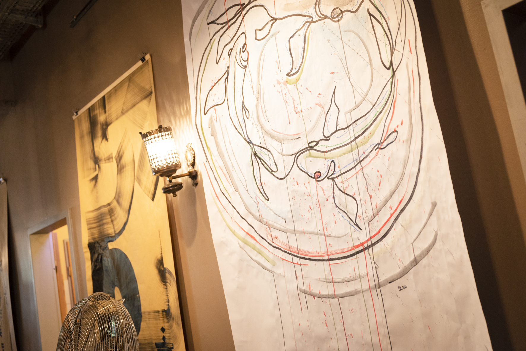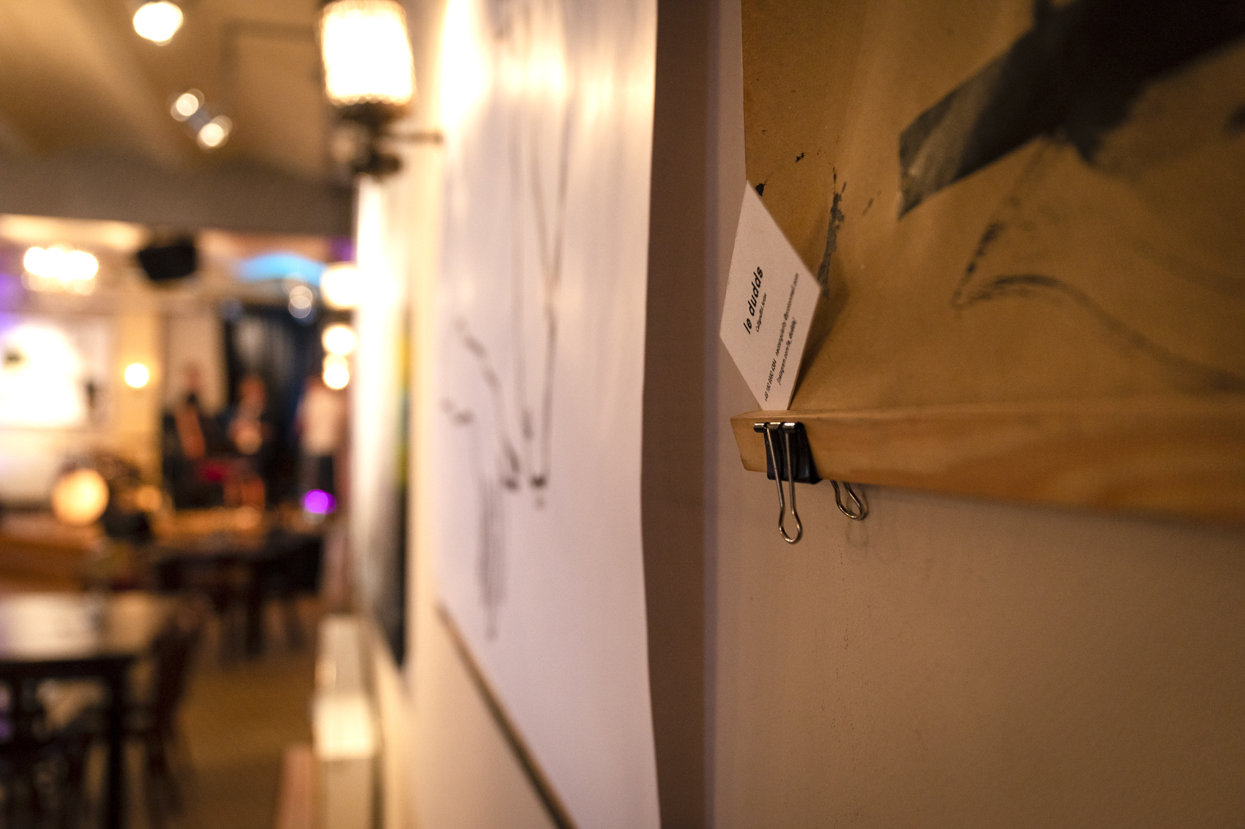 Das vorläufige Ergebnis dieses Prozesses ist/sind »Resonanzen«. Dass die Ausstellung gerade im Café ADA [LINK Homepage Q:M] stattfindet, ist übrigens keine bloße Willkür. Christine Mühlberger war schon immer von dem Raum und den Wänden fasziniert. Als ihr dann die Möglichkeit eröffnet wurde, tatsächlich das ADA zu bespielen, war für sie sofort klar, dass le dudds mit ihr ausstellen sollte. Der Raum ist also eine maßgebende Instanz im Schaffensprozess der Werke. Diese Nuance spiegelt sich wiederum auch in der Entwicklung von Christine Mühlbergers Kunstwerken ab. Während sie vor knapp zwei Jahren noch kleine Formate bespielte, wuchsen die Blätter mit den größer werdenden Wänden, an denen sie hingen. Eine solche kollektive Ausstellung heißt immer mehr als die bloße Addition zweier Arten der Kunst. Sie schaffen vielmehr eine Verschränkung beider Arten und ist somit selbst Neues und Einzigartiges. Für die beiden Kunstschaffenden wurde diese Verschränkung über den Schaffensprozess auch im Hinblick auf die Resonanzen zur Ausstellung deutlich. Die Betrachtung der Ausstellung bedarf Hingabe, eröffnet aber beiden Künstler*innen der Zugang zu neuem Publikum, was eine Vielzahl von neuartigen Betrachter*innenpositionen mit sich bringt.