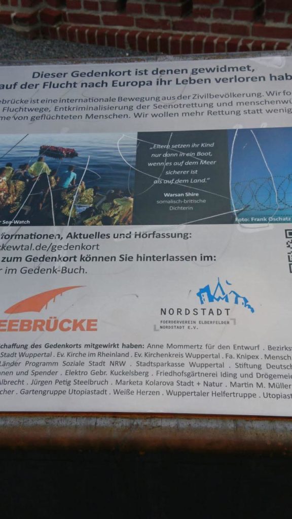 »Letzte Woche Samstag, am 21. Mai, wurde der Gedenkort für Menschen, die auf der Flucht nach Europa ums Leben kamen, am Mirker Bahnhof von der Seebrücke Wuppertal eingeweiht. Der u.a. von der Stadt Wuppertal geförderte Gedenkort besteht aus einem großen, im Erdboden versunkenen Schiff aus Stahl, einer Info-Stele mit Fotos und Textinformation. In der Nacht von Mittwoch auf Donnerstag wurde die Platte auf der Stele irreversibel beschädigt, gleich zweimal wurde „NSU“ als Verweis auf den „Nationalsozialistischen Untergrund“ mit wasserfestem Stift aufgekritzelt und in die Mitte der Platte in die Fotografien eingeritzt.