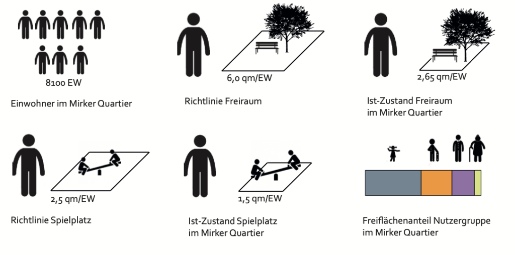 Wichtigste Erkenntnisse aus dem Projekt: Das Mirker Quartier weist Probleme im Bereich der Freiflächen auf. Vorhandene Freiflächen sprechen eher Kinder und Jugendliche an. Es fehlen etwa 40-60% Commons-Räume.