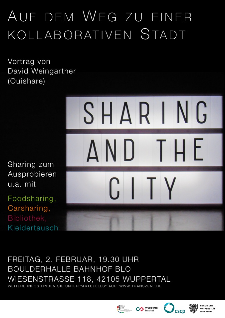 Wie kann Sharing unsere Städte sozialer und nachhaltiger machen? Und wie könnte eine „Sharing City Wuppertal“ aussehen? Um Fragen wie diese geht es in dem neuen Forschungsprojekt „UrbanUp – UpScaling-Strategien für eine Urban Sharing Society“, das das Zentrum für Transformationsforschung und Nachhaltigkeit der Bergischen Universität (TransZent) in den nächsten viereinhalb Jahren gemeinsam mit dem Wuppertal Institut für Klima, Umwelt, Energie und dem Collaborating Centre on Sustainable Consumption and Production (CSCP) durchführt. Interessierte sind herzlich willkommen!
