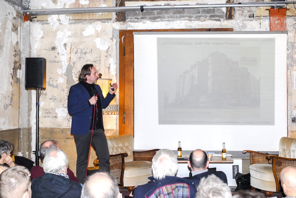Mit Informationen über den Wuppertaler Wohnungsmarkt führte Guido Spars, Professor an der Bergischen Universität für die Ökonomie des Planens und Bauens, in die Veranstaltung ein. Seit den 70er Jahren hatte Wuppertal rund 70.000 Einwohner verloren, nach leichten Zuwächsen in den letzten Jahren liegt die Einwohnerzahl aktuell bei über 350.000. Der Wohnungsleerstand vor allem in der Talachse konnte in den letzten Jahren verringert werden. Die Mieten für neu vermietete Wohnungen stiegen um ca. 9% und grundsätzlich in allen Mietpreissegmenten. Da eine Knappheit an Wohnbauflächen zu höheren Preisen führt, wurden Freiflächenpotentiale identifiziert, allerdings hängt die Verfügbarkeit dieser Flächen von verkaufswilligen Eigentümern ab. Eine umfassende öffentliche oder politische Debatte über den Umgang mit (Frei-)Flächen, Immobilien und Renditen gebe es aber aktuell nicht, konstatierte Spars.
