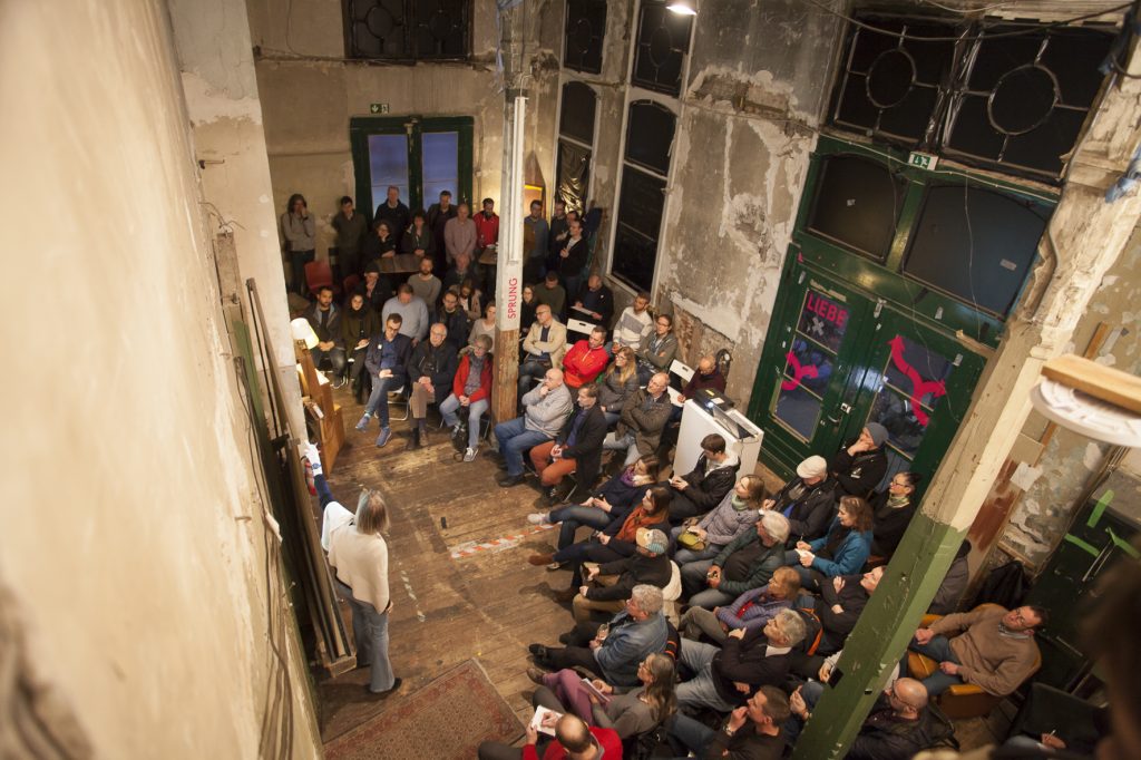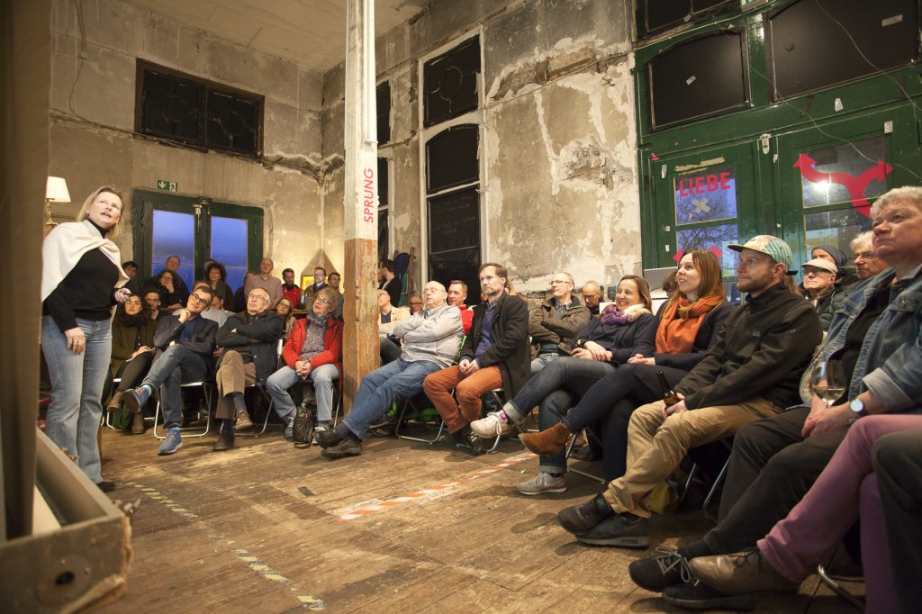 Der zeitlose und alternative Charme des ehemaligen Wartesaals 3. Klasse ist einfach liebenswert. Bei warmem Licht, nehmen die Besucher*innen Platz. Auf Grund des großen Andranges bleibt es nicht aus, dass einige von ihnen stehen müssen. Inge Grau, Mitglied des Organisationsteams des Forum:Mirke, leitet in den Abend ein und stellt das Format des Abends vor. Die Stimmung im Raum sprudelt vor Erwartungen an die Vorträge der zwei Gäste. Zwischen der Nordbahntrasse und der baldigen Fahrradstraße „Neue Friedrichstraße“ macht sich Raum für greifbare Utopie auf.