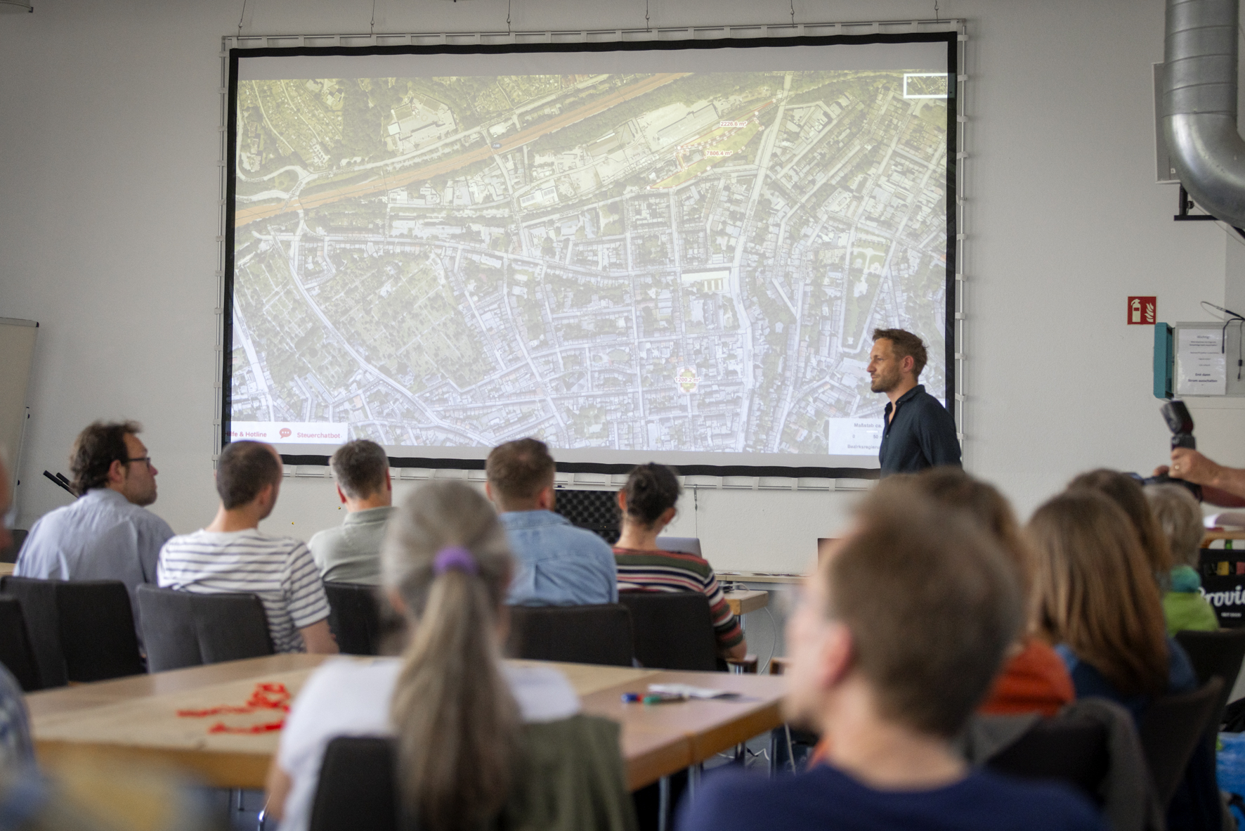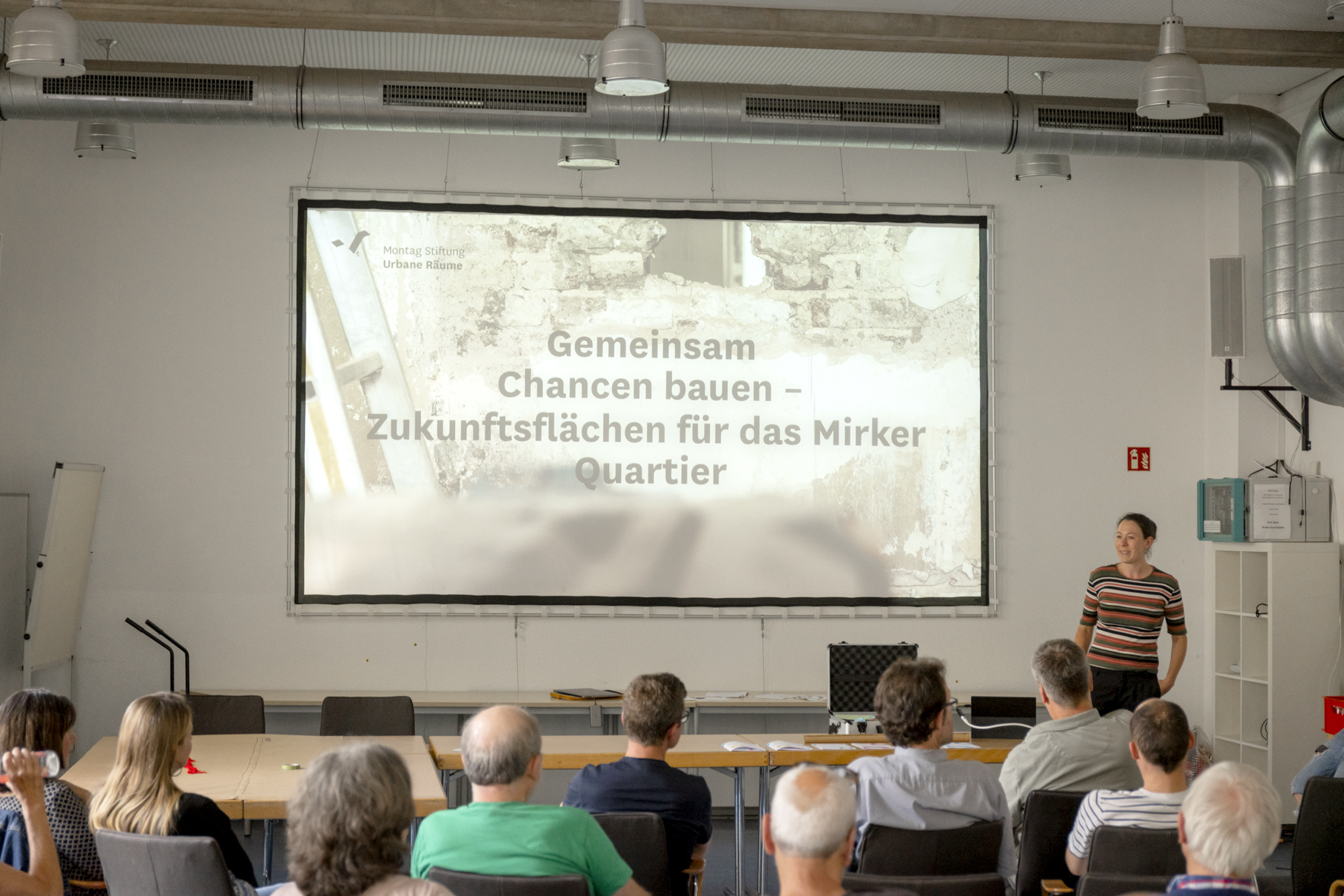 Der Vorstellung der Flächen folgte ein Vortrag von Mona Gennies. Die Bauassessorin und Referentin für Gemeinwohl der „Montag Stiftung Urbane Räume“ zeigte neben realen Beispielen für die Gestaltung von Stadtentwicklungsprozessen auch auf, warum es überhaupt wichtig ist, die Stadtgesellschaft mit einzubinden: Partizipation ist ein zentrales Element demokratischer Gesellschaften, die sich eben dadurch auszeichnen, dass Menschen kollektiv Entscheidungen treffen. Sie stärkt die Gemeinschaft, hilft dabei, Nutzungen zu entwickeln, die sich an realen Bedarfen orientieren und schafft Akzeptanz. Wir alle kennen das Phänomen des Elfenbeinturms und wissen auch, dass es uns nicht weiter bringen. Gemeinsam Entscheidungen zu treffen, gleicht außerdem einer Manifestation von lokalem Wissen, schließlich sind wir als Bewohner*innen des Quartiers Expert*innen unserer Bedürfnisse. Zuletzt führte Gennies auch den Punkt an, dass das Denken außerhalb herkömmlicher Prozesse Raum für neue Ideen und Lösungen schafft.