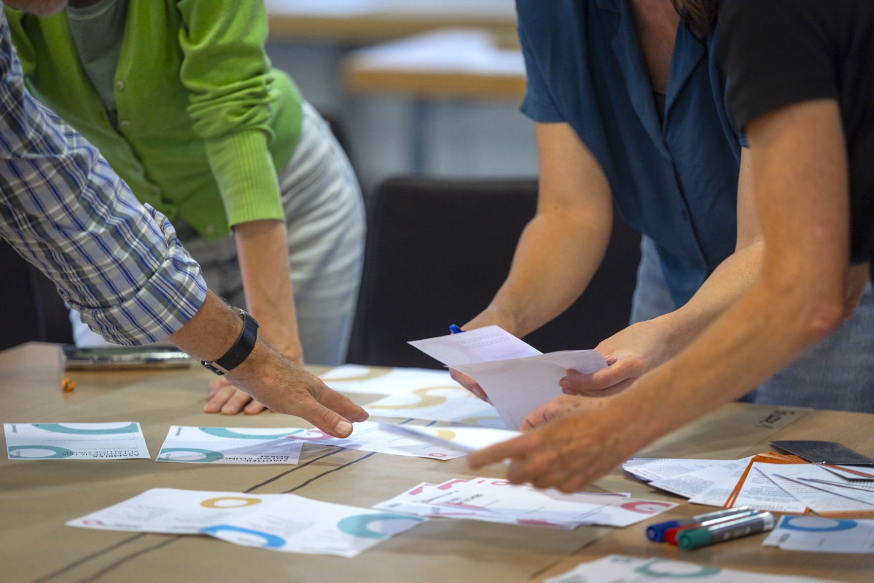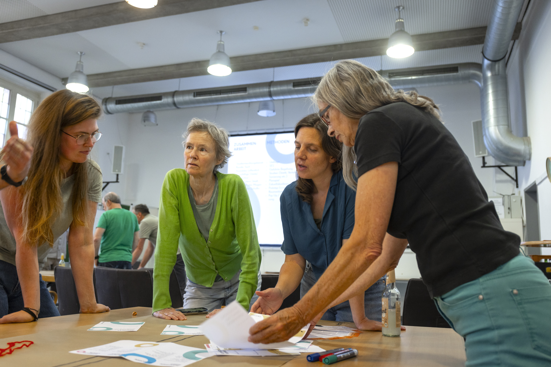 Nach diesen intensiven Vorträgen und Impulsen wurde der Stadtentwicklungssalon zu einer experimentellen Werkstatt. In vier Arbeitsgruppen kamen die Teilnehmer*innen an verschiedenen Tischen zusammen und widmeten sich großen leeren Papieren, die von einem roten Zeitstrahl durchtrennt wurden. Anhand dieser Linie wurden dann Szenarien entworfen, die sich der Gestaltung der Prozesse der vorgestellten Areale widmeten. Dabei wurden z.B. diese Fragen aufgeworfen: Ist es sinnvoll, die Beteiligung der Anwohner*innen erst zu ermöglichen, nachdem Investor*innen das Gebäude bereits erworben haben? Wie intensiv sollten Bedarfe der Stadtgesellschaft ermittelt werden, bevor Projekte zum Verkauf angeboten werden? Sollten Flächeninhaber*innen bereits vor dem Verkauf Bedarfe ermitteln und den Verkauf an bestimmte Zwecke binden? Wie können Bedarfe überhaupt sinnvoll abgefragt werden?