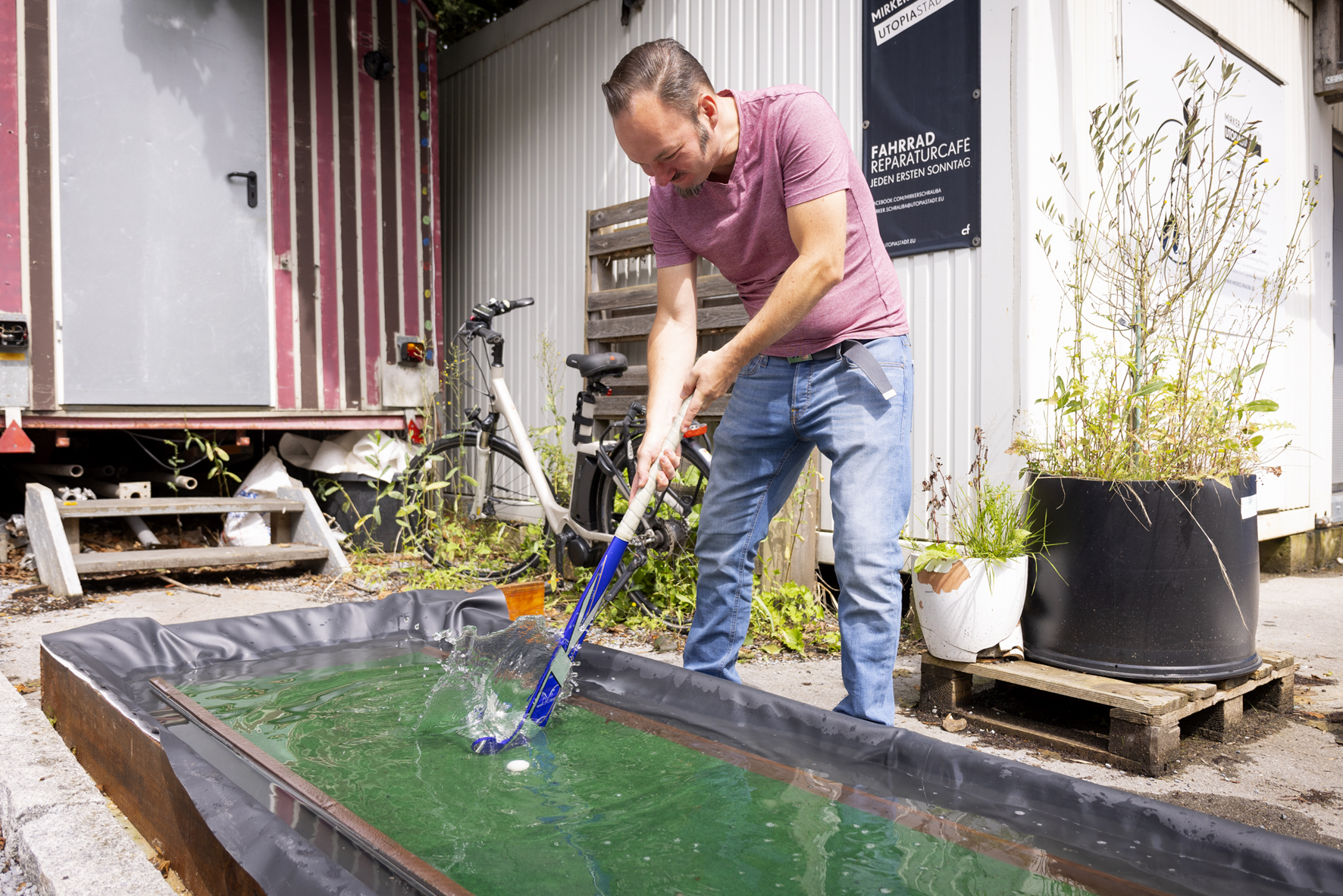 Über Supaknut und Special Agent D.D.Q. müssen wir wohl nicht viele Worte verlieren. Die zwei sind inzwischen fester Bestandteil des Quartiers und versorgen begeisterte Wuppertaler*innen bereits seit 13 Jahren mit frischen Konzepten und schlauem Upcycling. Hank Zerbolesch ist in Wuppertal vor allem für seine Romane und seinen Musikgeschmack bekannt. Tatsächlich hilft er aber auch Jahr für Jahr bei der Umsetzung von Supagolf. Die Drei treffen wir an der Rezeption direkt vor der Hebebühne. Während des Interviews kommen Interessierte vorbei und leihen sich neben einem Profi-Schläger und Ball auch ein Randsportartenbegleitheft und einen Bleistift aus U-Boot-Stahl aus – letzterer taucht auf Grund seiner Beschaffenheit stets wieder auf.