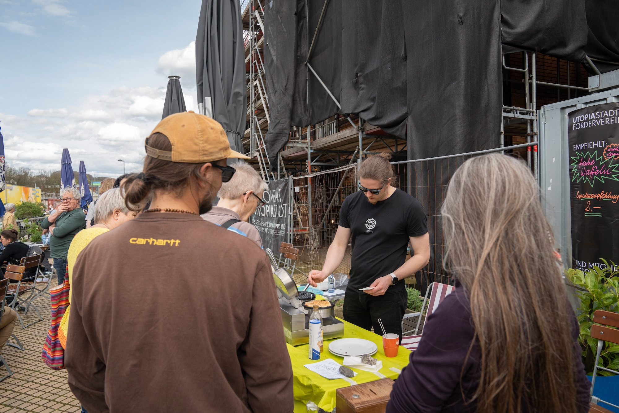 Auf den ersten Blick vielleicht ein verwunderlicher Zusammenhang. Schließlich ist es Teil des utopischen Selbstverständnisses, dass die Türen Utopiastadts zu jeder Zeit aufgestellt sind. Doch wie Amanda berichtet, ist der Tag der offenen Tür die logische Konsequenz der Erkenntnis, dass es einen Unterschied macht, eine Tür lediglich aufzuschließen, statt zusätzlich davorzustehen und hereinzubitten. Die heutige Veranstaltung ist somit als Ergebnis eines Lernprozesses zu verstehen, der Teil des Projekts ist. Und diese Erkenntnis findet bereits seit dem 1. April 2023 ihre Umsetzung. Damals fand der erste Tag der offenen Tür statt und das Wetter meinte es weniger gut mit den Utopist*innen. Es regnete in Strömen und alle zweifelten daran, dass sich überhaupt eine Seele nach Utopiastadt verirren würde, berichtet Amanda. Doch es kam anders: Besucher*innen pilgerten von ihrer Neugier angetrieben trotz des widrigen Wetters zum historischen Bahnhofsgebäude. Von dem großen Interesse überwältigt, wurde der nächste Tag der offenen Tür bereits im September 2023 veranstaltet. Heute findet der dritte Tag der offenen Tür statt und seitdem Utopiastadt sich zu einer Baustelle verwandelte, ist das Interesse der Wuppertaler*innen nach wie vor ungebrochen. Jegliche Führung ist voll besetzt und die Utopist*innen kommen im Rahmen ihrer ehrenamtlichen Engagements kaum hinterher, über den Stand der Dinge zu informieren. Der Tag der offenen Tür ist der Versuch, diese Informationslücke zu schließen und den Wuppertaler*innen das Tun und die Logik Utopiastadts näherzubringen.