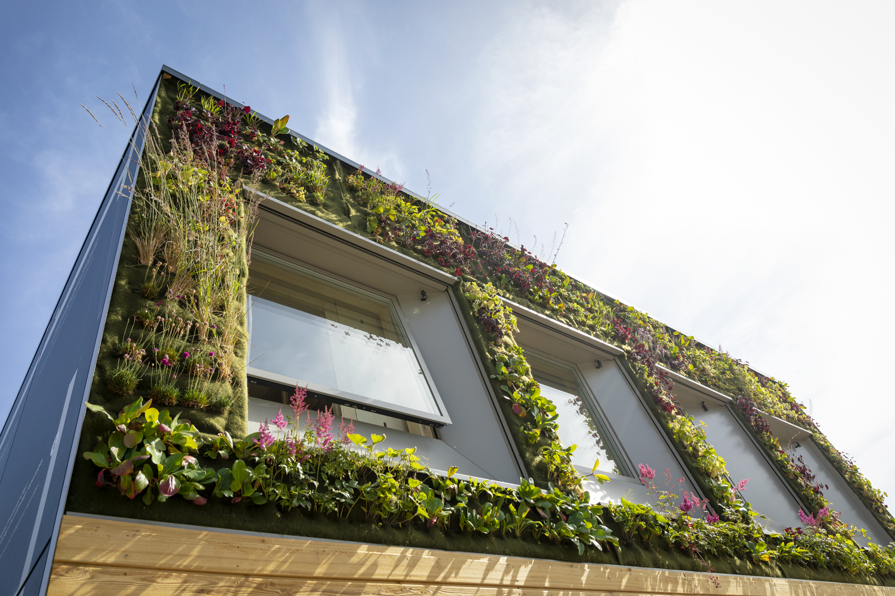Zeitgenössisches und innovatives Bauen impliziert heute fast immer auch die Digitalisierung von Wohnraum – Team LOCAL+ macht da keine Ausnahme, denn das gesamte Haus ist mit einem Smart-Home-System ausgestattet. Das ermöglicht natürlich eine Vielzahl an Spielereien, die nicht wirklich notwendig sind, setzt aber auch die Basis dafür, Daten auszulesen und diese im Sinne der Nachhaltigkeit für zukünftige Handlungen mit einzubeziehen. Das Haus kann z. B. auf die Wettervorhersage zugreifen und selbst berechnen, wann es welche Stromquelle und Wasserquelle anzapfen soll, um möglichst nachhaltig und kostengünstig zu agieren. Überschüssige Energie kann dann kostengünstig eingekauft und in den hauseigenen Batterien gespeichert werden. Auf dem Dach sind außerdem sogenannte PVT-Zellen (Photo-Voltaik-Thermal-Zellen) verbaut. Diese besondere Art der Solarzellen erlaubt es, zeitgleich Strom und Wärmeenergie zu erzeugen. Im Fokus einer realen Umsetzung des Konzepts sollen zudem die benachbarten Häuser technisch modernisiert werden, um als gemeinsame Stromproduzentin wirksam zu werden. Die überschüssige Energie, die im Sommer produziert wird, soll laut Konzept in Wasserstoff umgewandelt werden und somit im Garten langfristig speicherbar gemacht werden. Dieser Teil des Konzepts konnte aber aus Sicherheitsgründen nicht im Demonstrator nachgebaut werden. Neben den PVT Zellen ist im Haus zusätzlich ein Eisspeicher verbaut, der es ermöglicht, Kälte bzw. Wärme zu speichern. In dem Eisspeicher befinden sich 2150 längliche Behältnisse, in denen sich ein Anti-Frost-Mittel befindet. Darum herum fließt eine Glukosol-Wasser-Mischung, die mit einer Pumpe in die PVT Anlagen und in die Schläuche in den Decken gepumpt werden und somit zur Erwärmung bzw. Kühlung der Räume beitragen kann.