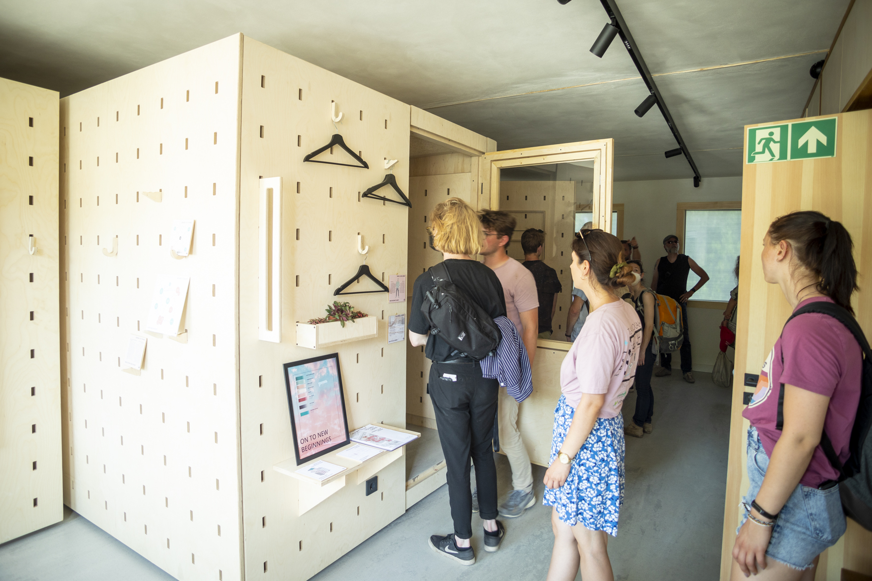 Mit der Präsentation des Demonstrators auf dem SDE 21/22 stellen die Studierenden aber nicht nur ein innovatives Konzept dar. Sie ermöglichen außerdem Einblicke in einen Prozess, der im Oktober 2019 begann und nun hier vorerst endet. In diesem Prozess wurde der Studienverlauf so angepasst, dass die Studierenden das Projekt im Rahmen ihres Studiums konzipieren und umsetzen konnten. Alle Studierenden haben in den letzten drei Jahren ihre Bachelorarbeit über verschiedene Teilaspekte des Konzepts geschrieben und damit auch rein wissenschaftlich eine enorme Basis erschaffen, auf die sich das Konzept stützt. Viele von ihnen werden auch ihr Masterstudium dem Projekt beenden. Der Demonstrator materialisiert daher nicht bloß Ideen, sondern bringt Forschung und Praxis hautnah aneinander. Und das wohlgemerkt unter pandemischen Bedingungen, die ein Zusammentreffen in Persona lange Zeit verunmöglichten. Dass dieses Zusammenkommen inzwischen wieder möglich ist, schafft auf dem Campus eine ganz besondere Atmosphäre. Auch wenn alle Teams in erster Linie damit beschäftigt waren, ihre eigenen Häuser zu errichten, herrschte keine Atmosphäre der Konkurrenz zwischen den einzelnen Teams. Stattdessen halfen sich die Teams nicht nur mit Restmaterialien und Werkzeugen aus, sondern auch mit Arbeitszeit. Die Abendstunden wurden außerdem zum gemeinsamen Feiern und Austausch genutzt. Während der gesamten Zeit haben die Studierenden allerdings nur wenig von dem Quartier mitbekommen. Die zweiwöchige Bauphase und anschließende Präsentationsphase nimmt die Studierenden so ein, dass sie selbst nur zwischen Unterkunft und Wettbewerbsgelände hin und her pendeln. Die meisten Einblicke erhielten die Studierenden damit tatsächlich in den Monaten der Planung, Konzeption und Ausarbeitung des Projekts.