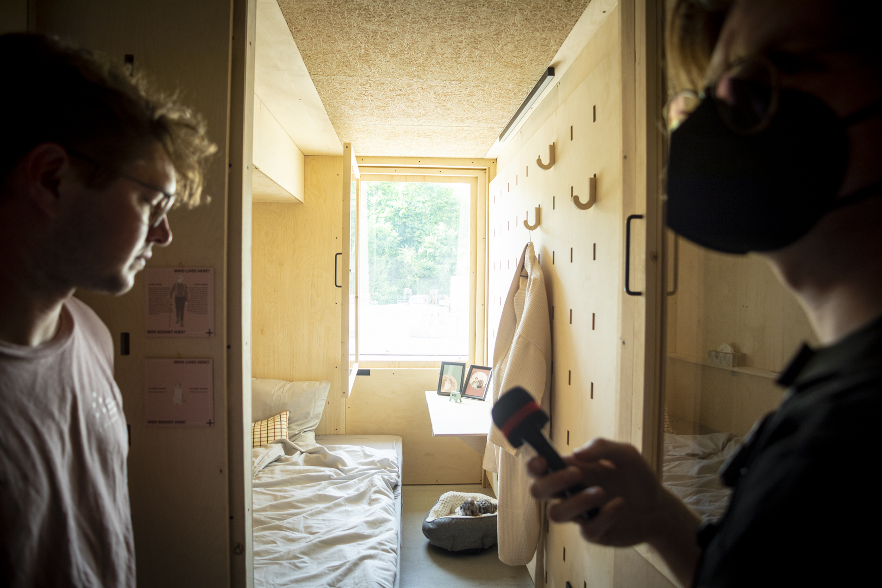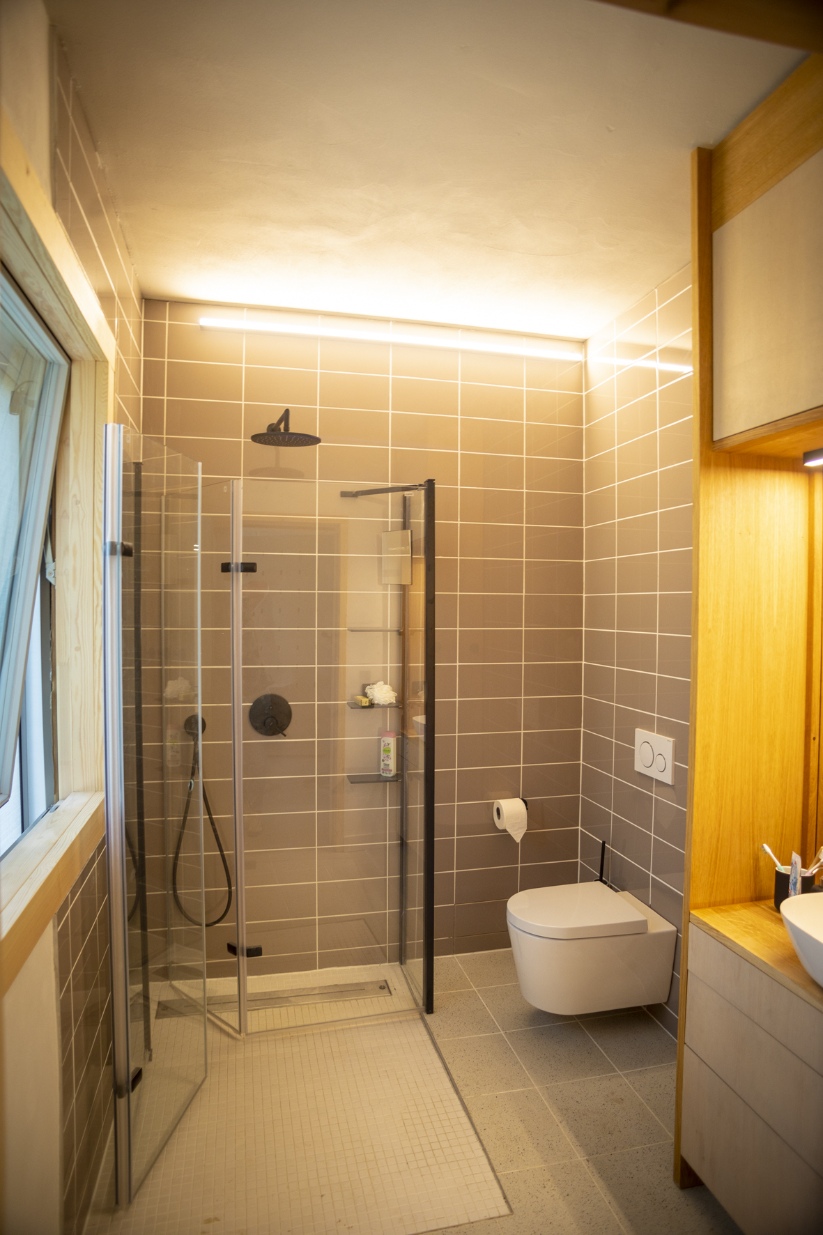 Im Erdgeschoss befindet sich der geteilte Lebensraum. In einer realen Situation würden hier wahrscheinlich die Bewohner*innen sitzen, sich unterhalten, gemeinsam kochen, zusammen essen und ihre gemeinsame Freizeit verbringen. Im darüber liegenden barrierefreien 1. OG befinden sich die privaten Räume – wobei es in der realen Umsetzung des Projekts drei weitere baugleiche Etagen geben würde. Als wir den 65qm großen Raum betreten, stellen wir fest, dass dort keine einzige Wand im Raum verbaut ist. Stattdessen stehen im Raum drei hölzerne, sogenannte „Cubes“. In jedem von ihnen befindet sich auf 4qm ein Bett, das zur Couch umgestellt werden kann, Staumöglichkeiten, zwei Fenster und ebenso viele Türen. Die Innen- und Außenwände sind als Pegboards gestaltet. Das heißt, in den äußeren Teilen der Wände sind in regelmäßigen Abständen Löcher angebracht, in die verschiedenen Module gesteckt werden können. Das ermöglicht die Anwendung eines modularen Systems, wodurch Möbel kurzfristig umgesteckt und somit umfunktioniert werden können. Der innenliegende Schreibtisch kann damit z.B. ohne großen Aufwand außerhalb des Cubes befestigt werden. Die hölzernen Würfel stehen auf Rollen und können dadurch durch den Raum verschoben werden. Das Konzept basiert grundlegend auf dem Gedanken, dass Wohnraum über viele Stunden am Tag eigentlich nicht genutzt wird und damit brach liegt. In einer herkömmlichen WG symbolisiert dieses Brachliegen die geschlossene Zimmertür. Durch die verschiebbaren Cubes wird die symbolisierte geschlossene Zimmertür auf den eigentlichen Cube reduziert, der im Raum verschoben werden kann, obwohl er geschlossen bleibt. Ist dein*e Mitbewohner*in also nicht zu Hause, kann sein*ihr Cube einfach in die Ecke gestellt werden und eröffnet somit mehr Raum für die übrigen Mitbewohner*innen. Letztendlich sind die Cubes aber mehr als hölzerne verschiebbare Zimmer. Sie sind außerdem mit technischen Komponenten ausgestattet, die z. B. die Luftzirkulation im Cube garantieren. Wie das funktioniert? Im inneren der verschiebbaren Räume befinden sich CO₂ Sensoren, die ab einer gewissen Grenzüberschreitung des Wertes ein geräuschloses Ventilatorsystem anschalten und damit für Luftzirkulation im Cube sorgen. Darüber hinaus können die Cubes aber auch an die Fenster der Außenwände gestellt werden – und so wird der hölzerne Raum, zum Cube mit Ausblick. Dem Team war es in der Konzeption aber auch wichtig, dass das Haus nicht für einen spezifischen Zweck gebaut wird, den es in 20 Jahren vielleicht gar nicht mehr erfüllen muss. Braucht es in 20 Jahren noch Wohnraum an dieser Stelle oder evtl. eher Büroraum? Dadurch, dass der Raum, in dem die Cubes stehen, nur von den Außenwänden getragen wird, wäre es zukünftig auch denkbar, den Raum ganz ohne Cube zu nutzen, oder aber Cubes zu konstruieren, die den benötigen Bedürfnissen entsprechen. Um das Konzept zu vervollständigen, befindet sich im 1. OG außerdem noch ein Badezimmer, in dem sich neben einem Waschbecken und einer Toilette auch eine Dusche mit Wärmerückgewinnung befindet.