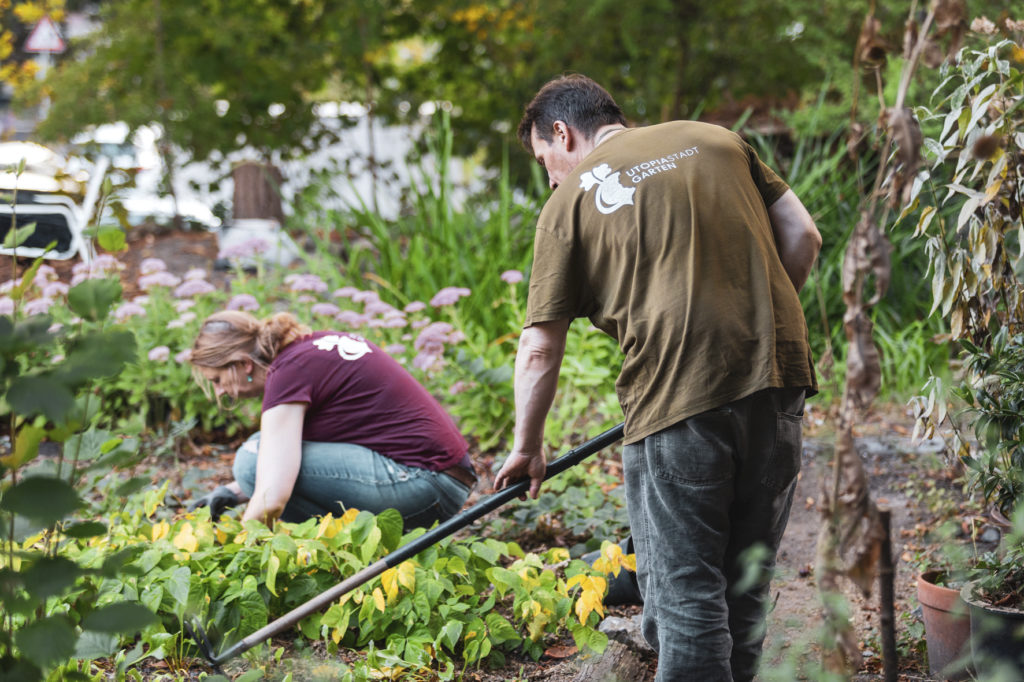 Doch obwohl die Gärten eine enorm wichtige Rolle für Mensch und Tier darstellen – sei es für Lebensmittelproduktion oder Erholung vom urbanen Stress – verschwinden sie nach und nach. Der klassische Vorgarten wird zum Steingarten umfunktioniert, das letzte Beet wird von einem Carport verdeckt. Obwohl laut eigener Aussage der deutschen Bürger*innen Gartenarbeit zu den liebsten Freizeitbeschäftigungen zählt, muss sie stets schnell von der Hand gehen. Die Schönheit und der Nutzen des Gartens wird an dessen Aufwand gemessen. Die Ehrenamtler*innen des UtopiastadtGarten nutzen den Garten wieder als Raum, der etwas hervorbringt und zurückgibt. Das ist in Anbetracht der Entwicklung des urbanen Raums keine Neuigkeit, denn Knappheit von Lebensmitteln führte in der Vergangenheit schon immer zum urbanen Gärtnern und damit zur Lebensmittelproduktion. Doch im Kontext des allmählichen Gartensterbens wird der UtopiastadtGarten zu einem Vorzeigeprojekt.