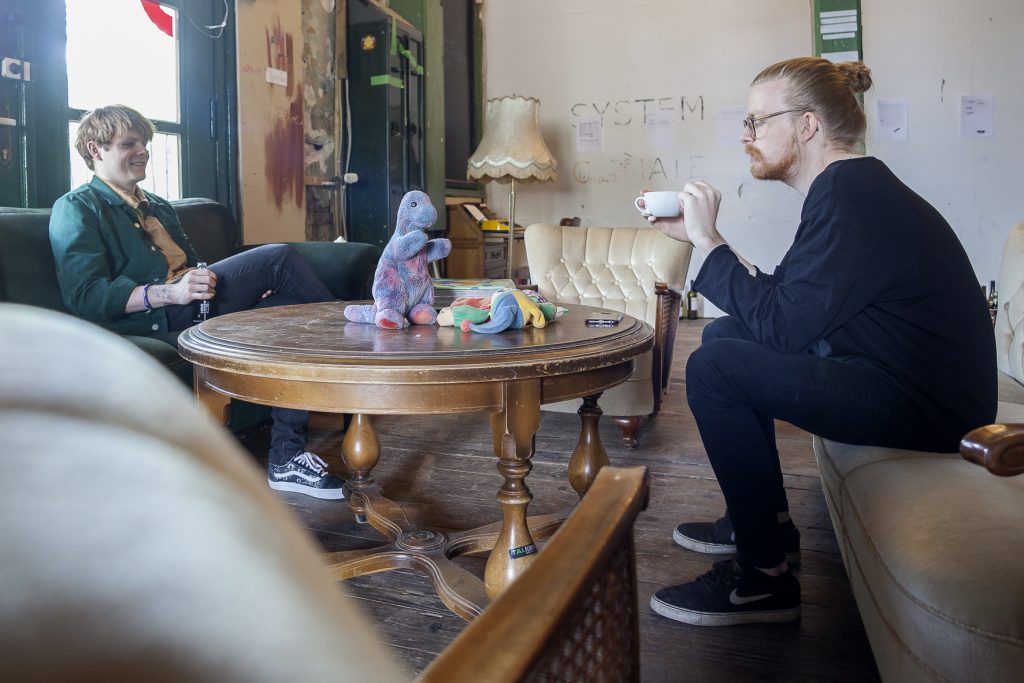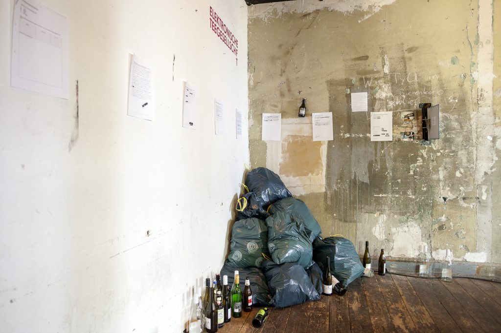 Wer in den vergangenen zwei Wochen den ehemaligen Wartesaal 3. Klasse des historischen Bahnhof Mirke – heute Utopiastadt – betrat, reagierte wohl etwas perplex. Vollgestopfte blaue Müllsäcke, leere Flaschen die wild herum stehen, Kinderbilder eines rothaarigen Jungen und Dokumente zieren die Wände, Kuscheltiere die neben einem Fotobuch auf einem Tisch verteilt liegen. Ein wenig skurril und abstoßend, zu gleich jedoch anziehend und intim. Der Raum erweckt Neugier und Scham. Die Besucher*innen tauchen in das Leben eines Anderen ein und erfahren unweigerlich Dinge die man normalerweise nicht so schnell über einen Menschen erfährt. Was hier vielleicht klingt wie ein voyeuristischer Detektivfall, ist ein Auszug aus dem Leben des Künstlers Fabian Nette. In seiner neuen Ausstellung „Wenn das Ich sich selbst als Du benennt“ präsentiert Nette der Zuschauerschaft einen Auszug aus seiner Kindheit. Das Besondere daran? Er selbst hat keine persönliche Erinnerung an den dargestellten Zeitraum seiner eigenen Kindheit.