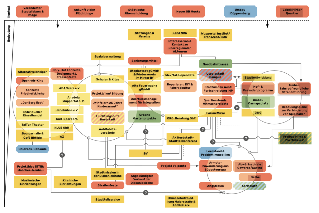 Produkt der Arbeit: Konstellationsanalyse des Mirker Quartiers im Sinne einer Kartierung der Entwicklung des Viertels, aus der sich kleinteilige Zusammenhänge und Entwicklungen nachvollziehen lassen