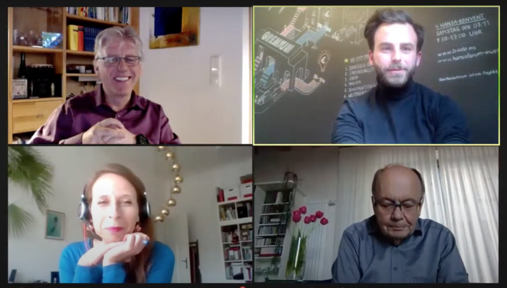 Mitschnitt aus dem Stream | (u.l.) Ricarda Pätzold, (u.r.) Dr. Michael Zumpe, (o.r.) Tobias Stroppel und (o.l.) Sascha Gajewski