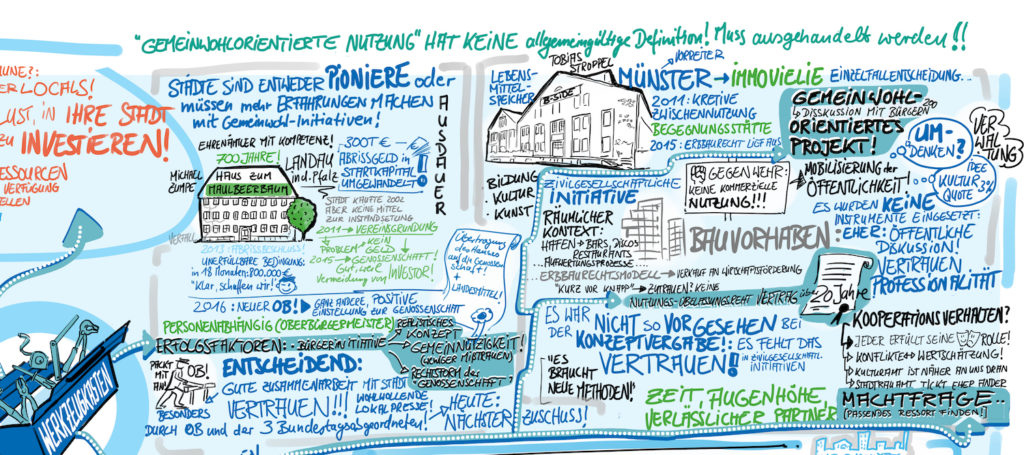 Auch Tobias Stroppel ist in einen bürgerschaftlichen Prozess der Sicherung und Entwicklung von urbanen Flächen involviert. Er ist Geschäftsführer der B-Side GmbH Münster, die einen Gebäudekomplex mit umliegenden Flächen im Münsteraner Stadthafen 1 sicherte und fortan für kreative und kulturelle Nutzung entwickelte. Bei dem Gebäudekomplex handelt es sich um einen recht zentrumsnahen ehemaligen Lebensmittelspeicher, der lange Zeit lediglich als Lagerraum genutzt wurde, bis er ab ca. 2010 durch kreative Akteur*innen zwischengenutzt wurde. Hier entwickelte sie eine nicht-kommerzieller kreativer Raum für Münsteraner*innen und Kultur. Ab 2015 liefen jedoch die Erbbaurechtsverträge aus und die Stadt wollte sowohl das Grundstück, als auch den umliegenden Hafen entwickeln. Angesichts der zentralen Lage und dem Standort Münster, blieb die Suche nach Investor*innen, die hochpreisige Büroräumlichkeiten entwickeln wollten, nicht lange erfolglos. Da die Stadt und die Investor*innen die bereits vorhandene aktiven Szene und Anwohnerschaft jedoch nicht in den Prozess mit einbezogen, entwickelte sich Protest aus der Zivilgesellschaft, die sich aktiv gegen eine kommerzielle Nutzung der Flächen, und für eine gemeinwohl- und bedarfsorientierte Entwicklung der Fläche, aussprach. Was genau unter Gemeinwohlorientierung im Quartier zu verstehen ist, wird im Rahmen der B-Side in halbjährlich stattfindenden Quartierskongressen mit 200 wechselnden und zufällig zusammengestellten Anwohner*innen des Quartiers ausgehandelt. In diesen Kongress entwickeln sie einen Quartiersgemeinwohlindex, in dem die Ziele der Gemeinnützigkeit festgeschrieben sind. Während in den kommenden Jahren das gesamte Umfeld zu renditenorientierten Glaspalästen modernisiert wird, bleibt die B-Side als Insel und Produkt des zivilgesellschaftlichen Engagement für das Quartier bestehen. So wurden gemeinsam mit der Stadt und der Wirtschaftsförderung ein Nutzungsüberlassungsvertrag ausgehandelt, der der B-Side vorerst für die kommenden 20 Jahre ermöglicht, das Gebäude nach den festgeschriebenen Vorgaben zu nutzen. Eine Übertragung des Erbbaurechts war anfangs angedacht, wurde jedoch vonseiten der Stadt Münster nachfolgend zurückgezogen.