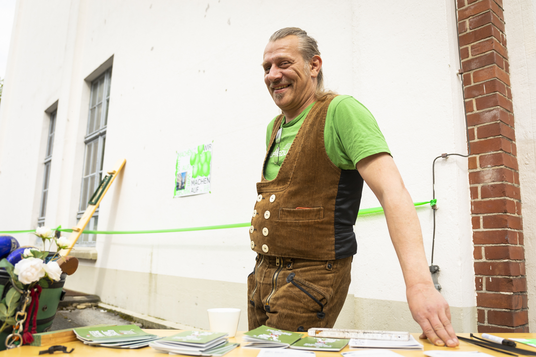 Wie das in Zukunft aussehen könnte, offenbaren die WiesenWerke schon durch eine symbolische Lücke im Zaun zur Wiesenstraße. Entlang des Zaunes soll durch den Wegfall einzelner Parkplätze zukünftig eine Quartiersfläche entstehen, die gemeinsam mit den Nachbar*innen geplant und mithilfe von Mitteln der Städtebauförderung finanziert werden soll. An diesem Tage wurden bereits erste Gestaltungsideen für die umliegenden Grünflächen, einen geplanten Weg zur Nordbahntrasse und die Quartiersfläche gesammelt und somit Anreize für Gespräche geschaffen werden, die sich trotz des Regenschauers nicht aufhielten ließen. Auch die kleinen Bewohner*innen des Quartiers gingen nicht leer aus. Neben dem umfangreichen Fuhrpark des Fanprojekts Wuppertal, konnte Tischtennis-Rundlauf und Supagolf gespielt, einzelne Ausstellungsstücke des Bandwebermuseums angeschaut und angefasst, und Blumentöpfe bemalt werden, die auf der zukünftigen Quartiersfläche aufgestellt werden sollen. Das Team des Bahnhof Blo sorgte im Innenraum und auf den Außenflächen währenddessen für das leibliche Wohl und schaffte eine Atmosphäre, in der die Quartiersbewohner*innen sich niederlassen und das bunte Treiben genießen konnten. Apropos Innen und Außen: Geschäftsführerin Silvia Harth bot drei Führungen durch die WiesenWerke an, im Rahmen derer Interessierte Fragen stellen konnten, Einblick in die Planung erhielten und bereits erste sanierte Räumlichkeiten begutachten durften. Weitere Informationen zu den WiesenWerken erhältst du hier [HOMEPAGE Q:M].