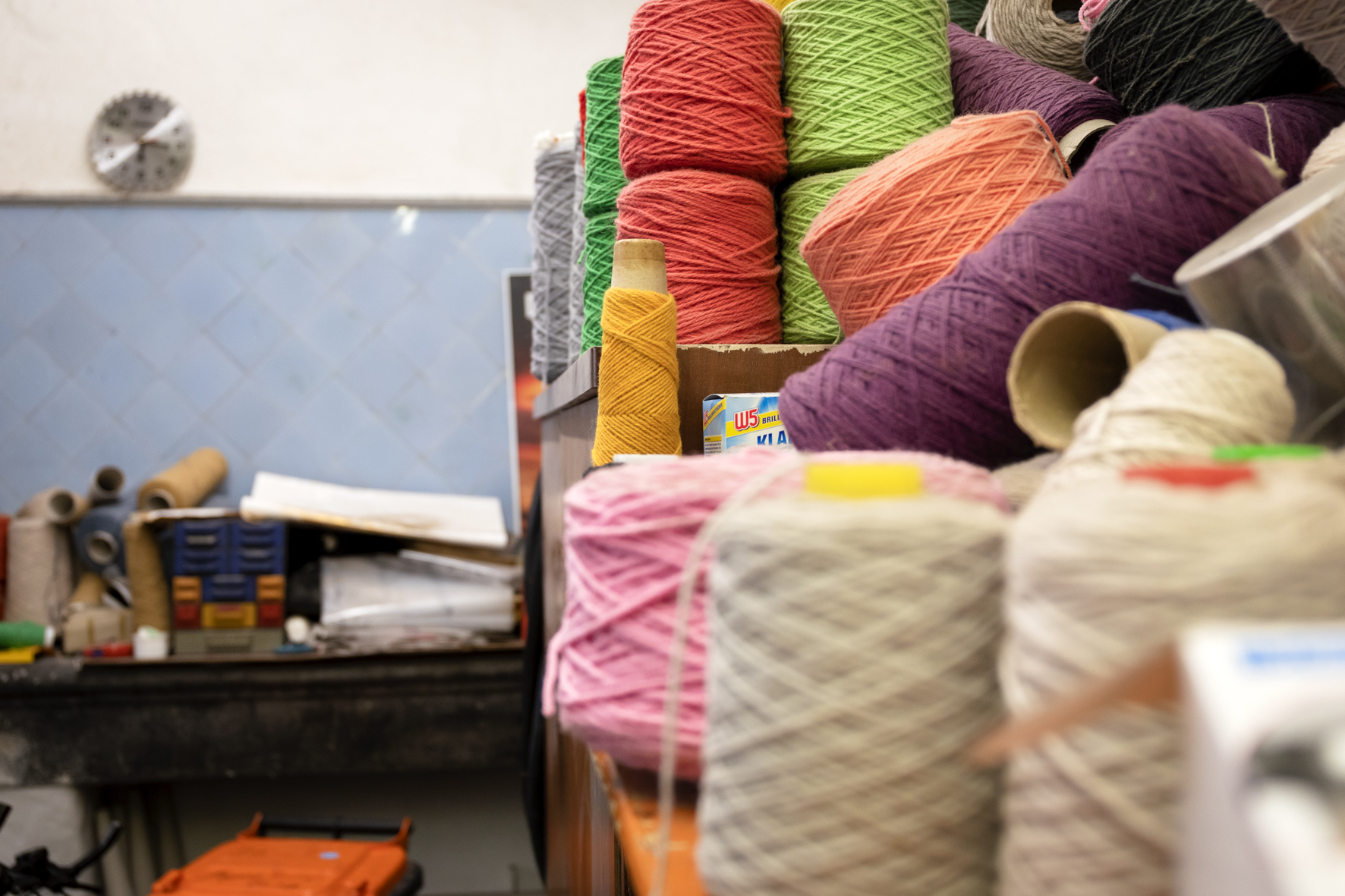 Aber wie wird man überhaupt Teppichkünstler*in? Wolrad Specht machte eine Ausbildung zum Wollstoffmacher und nahm anschließend ein Studium des Textildesigns bei Rudolf Schoofs an der Werkkunst-Schule in Wuppertal auf. Sein handwerkliches Geschick ermöglichte es Specht, einen Tufting-Arbeitsplatz in der Werkkunstschule einzurichten, an dem Studierende die Möglichkeit bekommen sollten, ihre Entwürfe auch praktisch umzusetzen. Hier entstanden seine ersten Teppiche und Entwürfe. Sein eigener Stil inspirierte seinen Lehrer Gerwald Kafka und seine Frau zu einer Zusammenarbeit und so arbeitete er von 1973 bis 1990 gemeinsam mit Frauke Kafka. Sie kümmerte sich um die Entwürfe und die Bürotätigkeiten, Specht um das Handwerkliche. 1990 trennten sich die Wege der Beiden dann. Als er 1982 in der Lederstraße wohnhaft wurde, sehnte er sich nach einem Arbeitsplatz, der in Nähe zu seinem Wohnort liegt. Er wurde auf das leerstehende, ehemalige Kutscherhaus aufmerksam und bezog es 1990. Von hier aus arbeitete er die letzten 32 Jahre Tag für Tag.